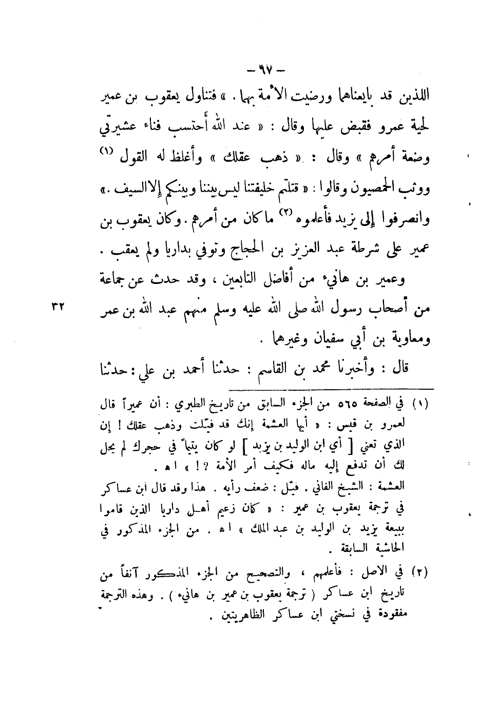 اللَّذَيْنِ قَدْ بَايَعْنَاهُمَا وَرَضِيَتِ الْأُمَّةُ بِهِمَا، فَتَنَاوَلَ يَعْقُوبُ بْنُ عُمَيْرٍ لِحْيَةَ عَمْرٍو فَقَبَضَ عَلَيْهَا وَقَالَ: عِنْدَ اللَّهِ أَحْتَسِبُ فَنَاءَ عَشِيرَتِي وَضِيعَةَ أَمْرِهِمْ، وَقَالَ: ذَهَبَ عَقْلُكَ وَأَغْلَظَ لَهُ الْقَوْلَ، وَوَثَبَ الْحِمْصِيُّونَ وَقَالُوا: قَتَلْتُمْ خَلِيفَتَنَا، لَيْسَ بَيْنَنَا وَبَيْنَكُمْ إِلَّا السَّيْفُ، وَانْصَرَفُوا إِلَى يَزِيدَ فَأَعْلَمُوهُ مَا كَانَ مِنْ أَمْرِهِمْ، وَكَانَ يَعْقُوبُ بْنُ عُمَيْرٍ عَلَى شُرْطَةِ عَبْدِ الْعَزِيزِ بْنِ الْحَجَّاجِ، وَتُوُفِّيَ بِدَارِيًّا، وَلَمْ يُعْقِبْ وَعُمَيْرُ بْنُ هَانِئٍ مِنْ أَفَاضِلِ التَّابِعِينَ، وَقَدْ حَدَّثَ عَنْ جَمَاعَةٍ مِنْ أَصْحَابِ رَسُولِ اللَّهِ صَلَّى اللَّهُ عَلَيْهِ وَسَلَّمَ، مِنْهُمْ عَبْدُ اللَّهِ بْنُ عُمَرَ وَمُعَاوِيَةُ بْنُ أَبِي سُفْيَانَ، وَغَيْرُهُمَا