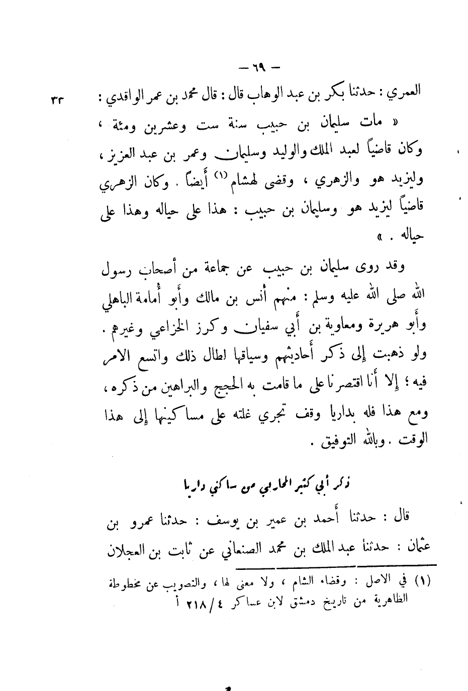 الْعُمَرِيُّ، حَدَّثَنَا بَكْرُ بْنُ عَبْدِ الْوَهَّابِ، قَالَ: قَالَ مُحَمَّدُ بْنُ عُمَرَ الْوَاقِدِيُّ: §" مَاتَ سُلَيْمَانُ بْنُ حَبِيبٍ سَنَةَ سِتٍّ وَعِشْرِينَ وَمِائَةٍ وَكَانَ قَاضِيًا لِعَبْدِ الْمَلِكِ وَسُلَيْمَانَ وَعُمَرَ بْنِ عَبْدِ الْعَزِيزِ، وَلِيَزِيدَ هُوَ وَالزُّهْرِيُّ، وَقَضَى لِهِشَامٍ أَيْضًا وَكَانَ الزُّهْرِيُّ قَاضِيًا لِيَزِيدَ هُوَ وَسُلَيْمَانُ بْنُ حَبِيبٍ: هَذَا عَلَى حِيَالِهِ، وَهَذَا عَلَى حِيَالِهِ " وَقَدْ رَوَى سُلَيْمَانُ بْنُ حَبِيبٍ، عَنْ جَمَاعَةٍ، مِنْ أَصْحَابِ رَسُولِ اللَّهِ صَلَّى اللَّهُ عَلَيْهِ وَسَلَّمَ مِنْهُمْ أَنَسُ بْنُ مَالِكٍ، وَأَبُو أُمَامَةَ الْبَاهِلِيُّ، وَأَبُو هُرَيْرَةَ، وَمُعَاوِيَةُ بْنُ أَبِي سُفْيَانَ، وَكُرْزٌ الْخُزَاعِيُّ، وَغَيْرُهُمْ، وَلَوْ ذَهَبْنَا إِلَى ذِكْرِ أَحَادِيثِهِمْ وَسِيَاقِهَا لَطَالَ ذَلِكَ وَاتَّسَعَ الْأَمْرُ فِيهِ، إِلَّا أَنَّا اقْتَصَرْنَا عَلَى مَا قَامَتْ بِهِ الْحُجَجُ وَالْبَرَاهِينُ مِنْ ذِكْرِهِ وَمَعَ هَذَا فَلَهُ بِدَارِيَّا وَقْفٌ تَجْرِي غَلَّتُهُ عَلَى مَسَاكِينِهَا إِلَى هَذَا الْوَقْتِ، وَبِاللَّهِ التَّوْفِيقُ