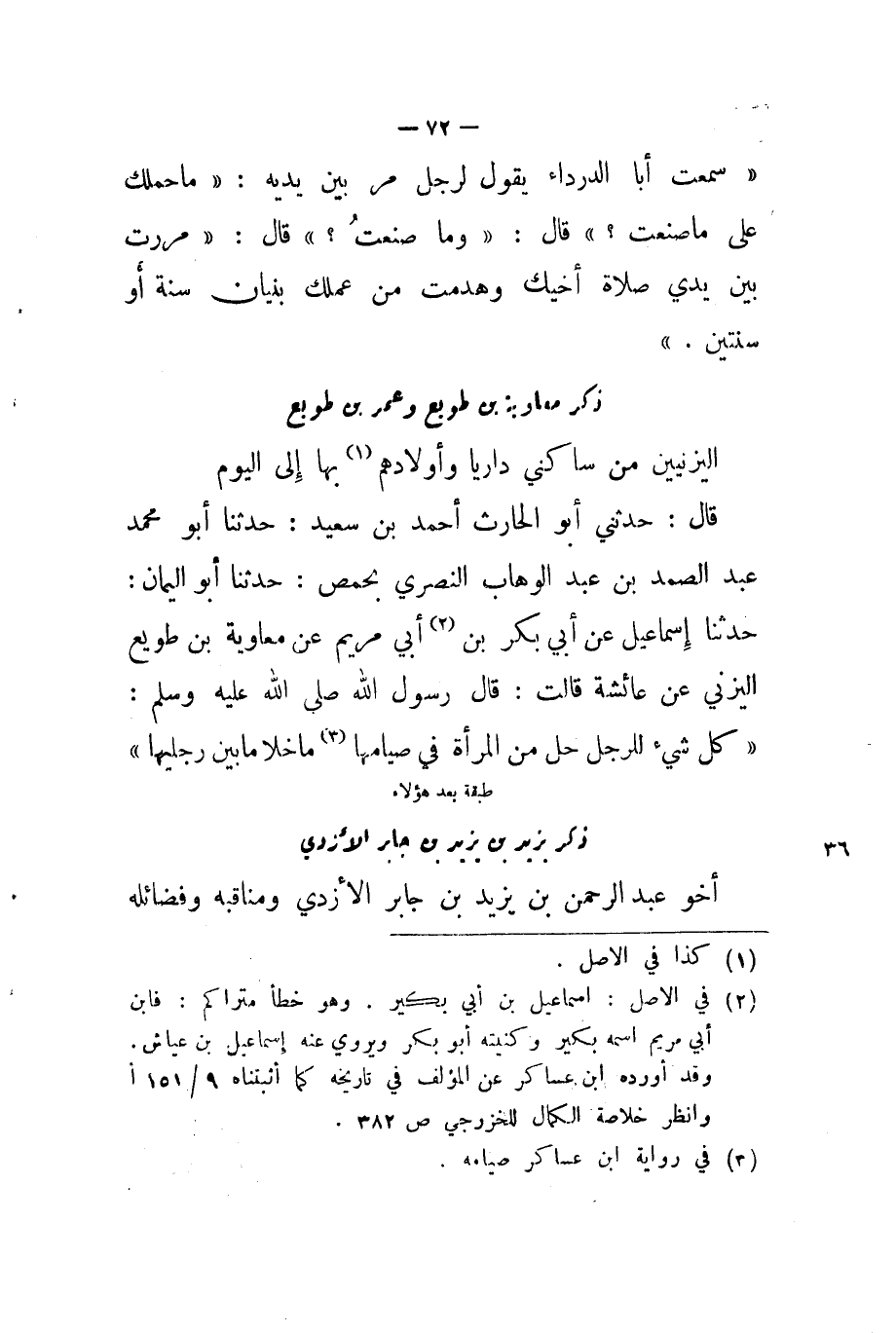 §ذِكْرُ مُعَاوِيَةَ بْنِ طُوَيْعٍ وَعُمَرَ بْنِ طُوَيْعٍ الْيَزَنِيَّيْنِ مِنْ سَاكِنِي دَارِيَّا وَأَوْلَادُهُمْ بِهَا إِلَى الْيَوْمِ