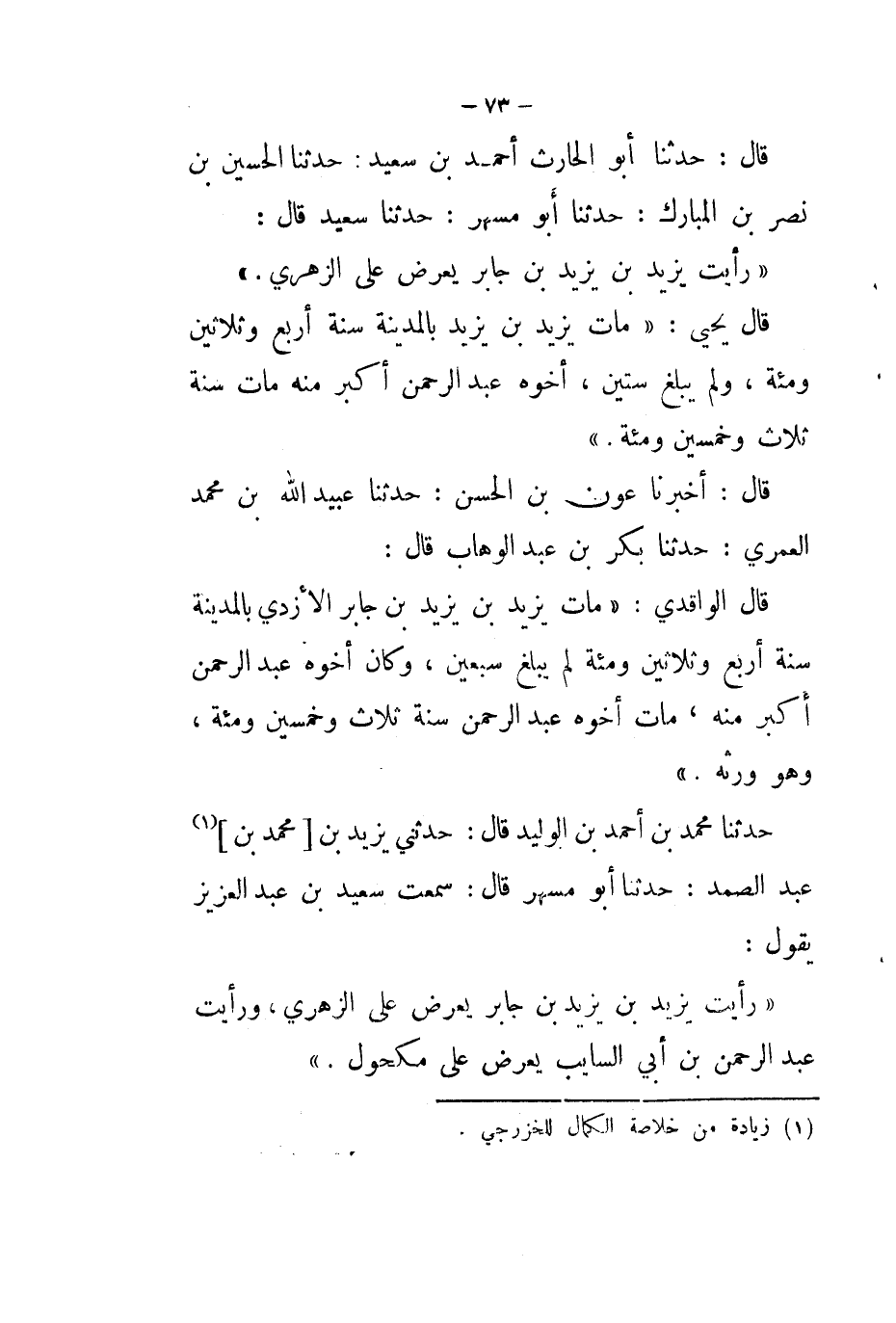 قَالَ: حَدَّثَنَا أَبُو الْحَارِثِ أَحْمَدُ بْنُ سَعِيدٍ، حَدَّثَنَا الْحُسَيْنُ بْنُ نَصْرِ بْنِ الْمُبَارَكِ، حَدَّثَنَا أَبُو مُسْهِرٍ، حَدَّثَنَا سَعِيدٌ، قَالَ: §«رَأَيْتُ يَزِيدَ بْنِ يَزِيدَ بْنِ جَابِرٍ يَعْرِضُ عَلَى الزُّهْرِيِّ» قَالَ يَحْيَى: مَاتَ يَزِيدُ بْنُ يَزِيدَ بِالْمَدِينَةِ سَنَةَ أَرْبَعٍ وَثَلَاثِينَ وَمِائَةٍ، لَمْ يَبْلُغْ سِتِّينَ، أَخُوهُ عَبْدُ الرَّحْمَنِ أَكْبَرُ مِنْهُ، مَاتَ سَنَةَ ثَلَاثٍ وَخَمْسِينَ وَمِائَةٍ قَالَ: وَأَخْبَرَنَا عَوْنُ بْنُ الْحَسَنِ، حَدَّثَنَا عُبَيْدُ اللَّهِ بْنُ مُحَمَّدٍ الْعُمَرِيُّ، حَدَّثَنَا بَكْرُ بْنُ عَبْدِ الْوَهَّابِ، قَالَ: قَالَ الْوَاقِدِيُّ: مَاتَ يَزِيدُ بْنُ يَزِيدَ بْنِ جَابِرٍ الْأَزْدِيُّ بِالْمَدِينَةِ سَنَةَ أَرْبَعٍ وَثَلَاثِينَ وَمِائَةٍ، وَلَمْ يَبْلُغْ سَبْعِينَ، وَكَانَ أَخُوهُ عَبْدُ الرَّحْمَنِ أَكْبَرَ مِنْهُ، مَاتَ أَخُوهُ عَبْدُ الرَّحْمَنِ سَنَةَ ثَلَاثٍ وَخَمْسِينَ وَمِائَةٍ، وَهُوَ وَرِثَهُ