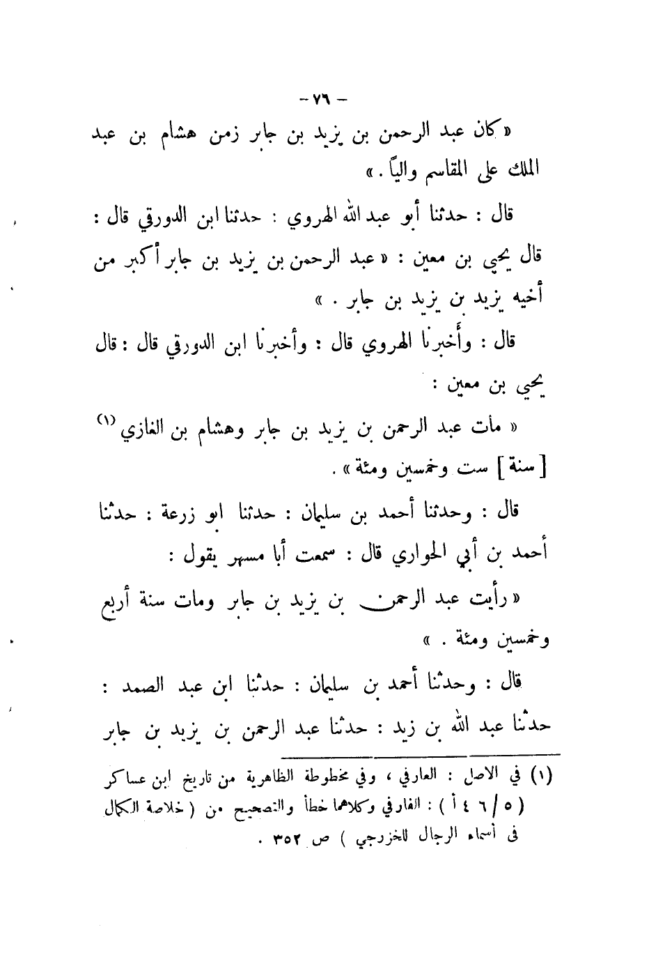 قَالَ: حَدَّثَنَا أَبُو عَبْدِ اللَّهِ الْهَرَوِيُّ، حَدَّثَنَا ابْنُ الدَّوْرَقِيِّ، قَالَ: قَالَ يَحْيَى بْنُ مَعِينٍ: §«عَبْدُ الرَّحْمَنِ بْنُ يَزِيدَ بْنِ جَابِرٍ أَكْبَرُ مِنْ أَخِيهِ يَزِيدَ بْنِ يَزِيدَ بْنِ جَابِرٍ» قَالَ: وَأَخْبَرَنَا الْهَرَوِيُّ، قَالَ: وَأَخْبَرَنَا ابْنُ الدَّوْرَقِيِّ، قَالَ: قَالَ يَحْيَى بْنُ مَعِينٍ: مَاتَ عَبْدُ الرَّحْمَنِ بْنُ يَزِيدَ بْنِ جَابِرٍ وَهِشَامُ بْنُ الْغَازِ فِي سَنَةِ سِتٍّ وَخَمْسِينَ وَمِائَةٍ قَالَ: وَحَدَّثَنَا أَحْمَدُ بْنُ سُلَيْمَانَ، حَدَّثَنَا أَبُو زُرْعَةَ، حَدَّثَنَا أَحْمَدُ بْنُ أَبِي الْحَوَارِيِّ، قَالَ: سَمِعْتُ أَبَا مُسْهِرٍ، يَقُولُ: رَأَيْتُ عَبْدَ الرَّحْمَنِ بْنَ يَزِيدَ بْنِ جَابِرٍ وَمَاتَ سَنَةَ أَرْبَعٍ وَخَمْسِينَ وَمِائَةٍ