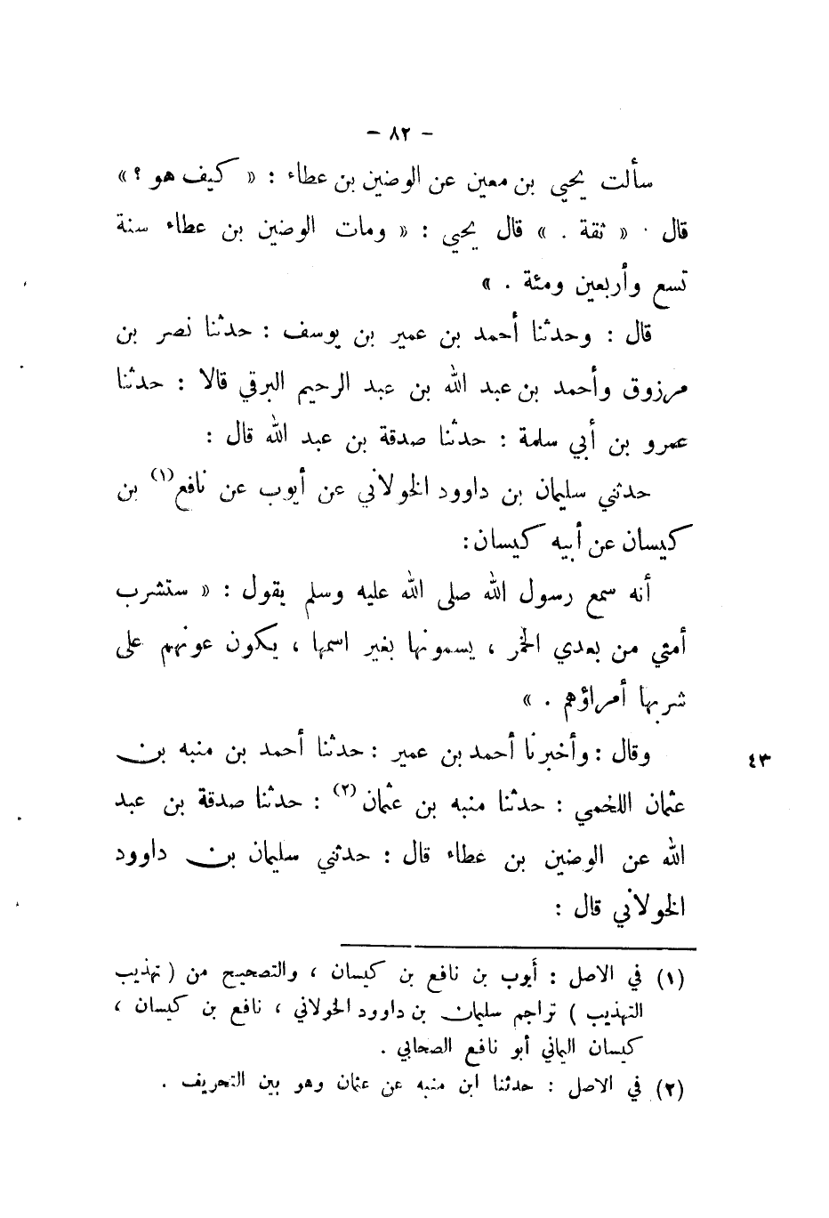 قَالَ: وَحَدَّثَنَا أَحْمَدُ بْنُ عُمَيْرِ بْنِ يُوسُفَ، حَدَّثَنَا نَصْرُ بْنُ مَرْزُوقٍ، وَأَحْمَدُ بْنُ عَبْدِ اللَّهِ بْنِ عَبْدِ الرَّحِيمِ الْبَرْقِيُّ، قَالَا: حَدَّثَنَا عَمْرُو بْنُ أَبِي سَلَمَةَ، حَدَّثَنَا صَدَقَةُ بْنُ عَبْدِ اللَّهِ، حَدَّثَنِي سُلَيْمَانُ بْنُ دَاوُدَ الْخَوْلَانِيُّ، عَنْ أَيُّوبَ، عَنْ نَافِعِ بْنِ كَيْسَانَ، عَنْ أَبِيهِ كَيْسَانَ، أَنَّهُ سَمِعَ رَسُولَ اللَّهِ صَلَّى اللَّهُ عَلَيْهِ وَسَلَّمَ يَقُولُ: «§سَتَشْرَبُ أُمَّتِي مِنْ بَعْدِي الْخَمْرَ، يُسَمُّونَهَا بِغَيْرِ اسْمِهَا، يَكُونُ عَوْنَهُمْ عَلَى شُرْبِهَا أُمَرَاؤُهُمْ»