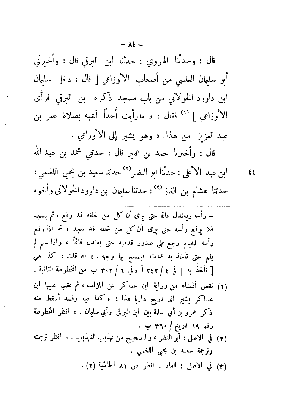قَالَ: وَحَدَّثَنَا الْهَرَوِيُّ، حَدَّثَنَا ابْنُ الْبَرْقِيِّ، قَالَ: وَأَخْبَرَنِي أَبُو سُلَيْمَانَ الْعَنْسِيُّ، مِنْ أَصْحَابِ الْأَوْزَاعِيِّ قَالَ: دَخَلَ سُلَيْمَانُ بْنُ دَاوُدَ الْخَوْلَانِيُّ مِنْ بَابِ مَسْجِدٍ - ذَكَرَهُ ابْنُ الْبَرْقِيِّ - فَرَأَى الْأَوْزَاعِيَّ يُصَلِّي فَقَالَ: §«مَا رَأَيْتُ صَلَاةً أَشْبَهَ بِصَلَاةِ عُمَرَ بْنِ عَبْدِ الْعَزِيزِ مِنْ هَذَا» وَهُوَ يُشِيرُ إِلَى الْأَوْزَاعِيِّ