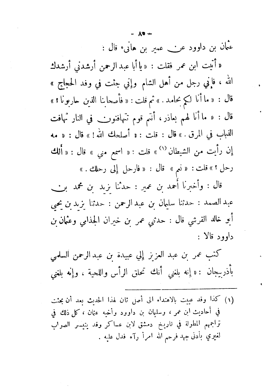 قَالَ: وَأَخْبَرَنَا أَحْمَدُ بْنُ عُمَيْرٍ، حَدَّثَنَا يَزِيدُ بْنُ مُحَمَّدِ بْنِ عَبْدِ الصَّمَدِ، حَدَّثَنَا سُلَيْمَانُ بْنُ عَبْدِ الرَّحْمَنِ، حَدَّثَنَا يَزِيدُ بْنُ يَحْيَى أَبُو خَالِدٍ الْقُرَشِيُّ، حَدَّثَنِي عُمَرُ بْنُ حُمْرَانَ الْجُذَامِيُّ، وَعُثْمَانُ بْنُ دَاوُدَ، قَالَا: كَتَبَ عُمَرُ بْنُ عَبْدِ الْعَزِيزِ إِلَى عُبَيْدَةَ بْنِ عَبْدِ الرَّحْمَنِ السُّلَمِيِّ بِأَذْرَبِيجَانَ: إِنَّهُ بَلَغَنِي أَنَّكَ تَحْلِقُ الرَّأْسَ وَاللِّحْيَةَ، وَإِنَّهُ بَلَغَنِي -[86]- أَنَّ رَسُولَ اللَّهِ صَلَّى اللَّهُ عَلَيْهِ وَسَلَّمَ قَالَ: «إِنَّ اللَّهَ تَعَالَى §جَعَلَ هَذَا الشَّعْرَ نُسُكًا، وَسَيَجْعَلُهُ الظَّالِمُونَ نَكَالًا» فَإِيَّاكَ وَالْمُثْلَةَ: جَزُّ الرَّأْسِ وَاللِّحْيَةِ، فَإِنَّ رَسُولَ اللَّهِ صَلَّى اللَّهُ عَلَيْهِ وَسَلَّمَ نَهَى عَنِ الْمُثْلَةِ