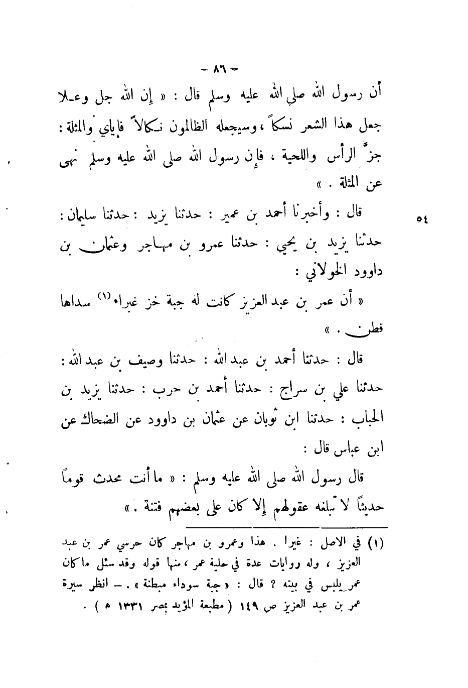 قَالَ: وَأَخْبَرَنَا أَحْمَدُ بْنُ عُمَيْرٍ، حَدَّثَنَا يَزِيدُ، حَدَّثَنَا سُلَيْمَانُ، حَدَّثَنَا يَزِيدُ بْنُ يَحْيَى، حَدَّثَنَا عَمْرُو بْنُ مُهَاجِرٍ، وَعُثْمَانُ بْنُ دَاوُدَ الْخَوْلَانِيُّ، أَنَّ عُمَرَ بْنَ عَبْدِ الْعَزِيزِ «كَانَتْ §لَهُ جُبَّةُ خَزٍّ غَبْرَاءُ، سُدَاهَا قُطْنٌ»
