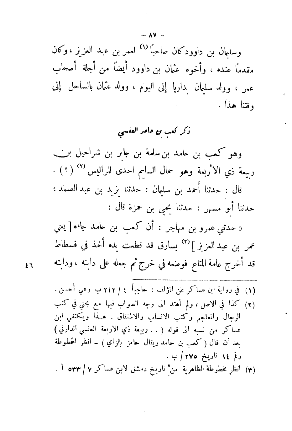 قَالَ: حَدَّثَنَا أَحْمَدُ بْنُ سُلَيْمَانَ، حَدَّثَنَا يَزِيدُ بْنُ مُحَمَّدِ بْنِ عَبْدِ الصَّمَدِ، حَدَّثَنَا أَبُو مُسْهِرٍ، حَدَّثَنَا يَحْيَى بْنُ حَمْزَةَ، حَدَّثَنِي عَمْرُو بْنُ مُهَاجِرٍ، أَنَّ كَعْبَ بْنَ حَامِدٍ " §جَاءَهُ بِسَارِقٍ قَدْ قُطِعَتْ يَدُهُ، أَخَذَ فِي فُسْطَاطٍ قَدْ أَخْرَجَ عَامَّةَ الْمَتَاعِ فَوَضَعَهُ فِي خُرْجٍ ثُمَّ جَعَلَهُ عَلَى دَابَّتِهِ، وَدَابَّتُهُ -[88]- مَرْبُوطَةٌ بِوَتَدِ الْفُسْطَاطِ، فَسَأَلَ كَعْبًا: كَيْفَ أَخَذَهُ؟ فَأَخْبَرَهُ، فَضَرَبَهُ دُونَ الْمِائَةِ ضَرْبًا وَجِيعًا ثُمَّ قَالَ: يَا عَمْرُو، خُذْهُ إِلَيْكَ، فَأَخَذْتُهُ، فَأَوْمَأَ إِلَيَّ أَنْ أَلْبِسْهُ جِلْدًا قَالَ: ثُمَّ سَأَلَنِي عَنْهُ بَعْدَ لَيْلَتَيْنِ: مَا فَعَلَ الرَّجُلُ الَّذِي ضَرَبْنَا؟ فَقُلْتُ: عِنْدِي يَا أَمِيرَ الْمُؤْمِنِينَ، قَالَ: هَلْ أَكَلَ؟ قُلْتُ: نَعَمْ، قَالَ: فَأَلْبَسْتَهُ جِلْدًا؟ قُلْتُ: نَعَمْ، قَالَ: فَإِذَا كَانَ فِي ثُلُثِ اللَّيْلِ فَسَرِّحْهُ " وَكَعْبُ بْنُ حَامِدٍ كَانَ عَلَى شُرْطَةِ عُمَرَ بْنِ عَبْدِ الْعَزِيزِ، وَوَلَدُهُ بِدَارِيَّا إِلَى الْيَوْمِ