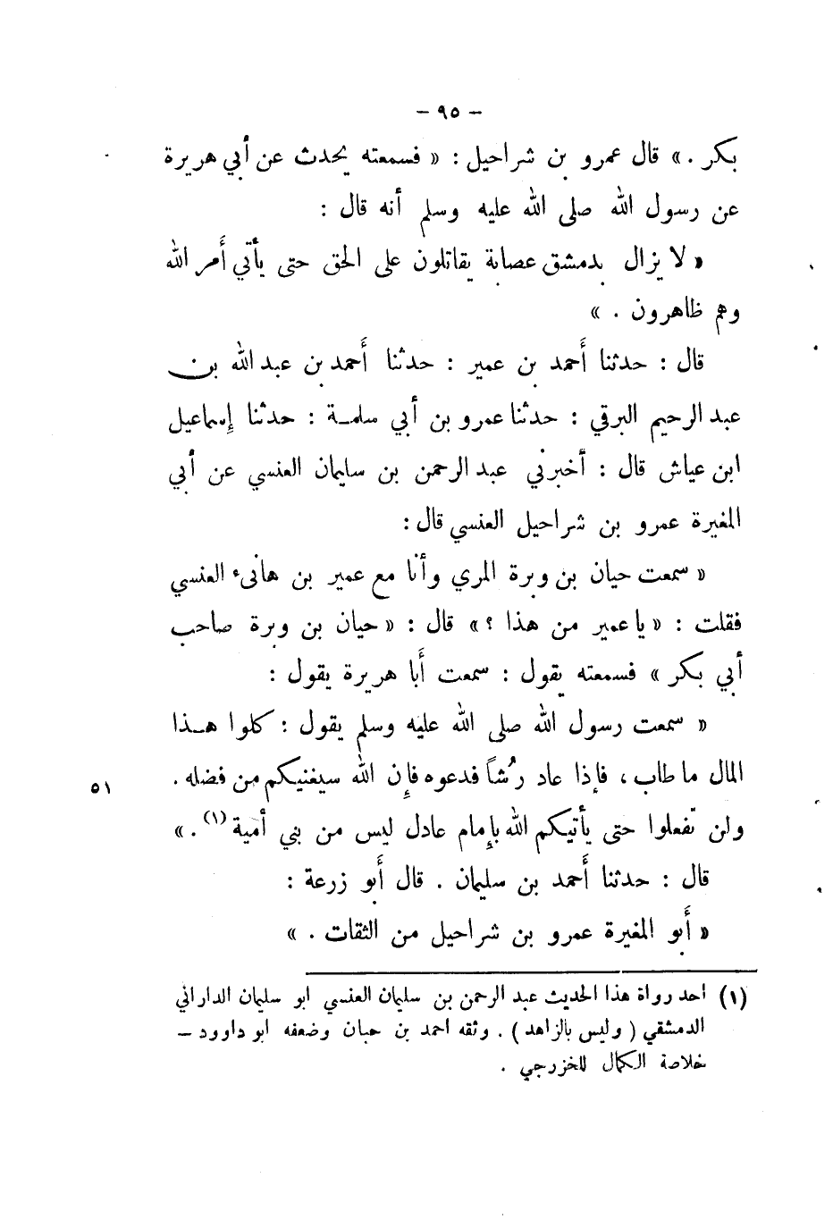 قَالَ: حَدَّثَنَا أَحْمَدُ بْنُ عُمَيْرٍ، حَدَّثَنَا أَحْمَدُ بْنُ عَبْدِ اللَّهِ بْنِ عَبْدِ الرَّحِيمِ الْبَرْقِيُّ، حَدَّثَنَا عَمْرُو بْنُ أَبِي سَلَمَةَ، حَدَّثَنَا إِسْمَاعِيلُ بْنُ عَيَّاشٍ، قَالَ: أَخْبَرَنِي عَبْدُ الرَّحْمَنِ بْنُ سُلَيْمَانَ الْعَنْسِيُّ، عَنْ أَبِي الْمُغِيرَةِ عَمْرِو بْنِ شَرَاحِيلَ الْعَنْسِيِّ، قَالَ: سَمِعْتُ حَيَّانَ بْنَ وَبَرَةَ الْمُرِّيَّ، وَأَنَا مَعَ عُمَيْرِ بْنِ هَانِئٍ الْعَنْسِيِّ، فَقُلْتُ: يَا عُمَيْرُ، مَنْ هَذَا؟ قَالَ: حَيَّانُ بْنُ وَبَرَةَ صَاحِبُ أَبِي بَكْرٍ رَضِيَ اللَّهُ عَنْهُ، فَسَمِعْتُهُ يَقُولُ: سَمِعْتُ أَبَا هُرَيْرَةَ يَقُولُ: سَمِعْتُ رَسُولَ اللَّهِ صَلَّى اللَّهُ عَلَيْهِ وَسَلَّمَ يَقُولُ: «§كُلُوا هَذَا الْمَالَ مَا طَابَ، فَإِذَا عَادَ رُشًا فَدَعُوهُ، فَإِنَّ اللَّهَ سَيُغْنِيكُمْ مِنْ فَضْلِهِ، وَلَنْ تَفْعَلُوا حَتَّى يَأْتِيَكُمُ اللَّهُ بِإِمَامٍ عَادِلٍ لَيْسَ مِنْ بَنِي أُمَيَّةَ» قَالَ: حَدَّثَنَا أَحْمَدُ بْنُ سُلَيْمَانَ، قَالَ: قَالَ أَبُو زُرْعَةَ: أَبُو الْمُغِيرَةِ عَمْرُو بْنُ شَرَاحِيلَ مِنَ الثِّقَاتِ