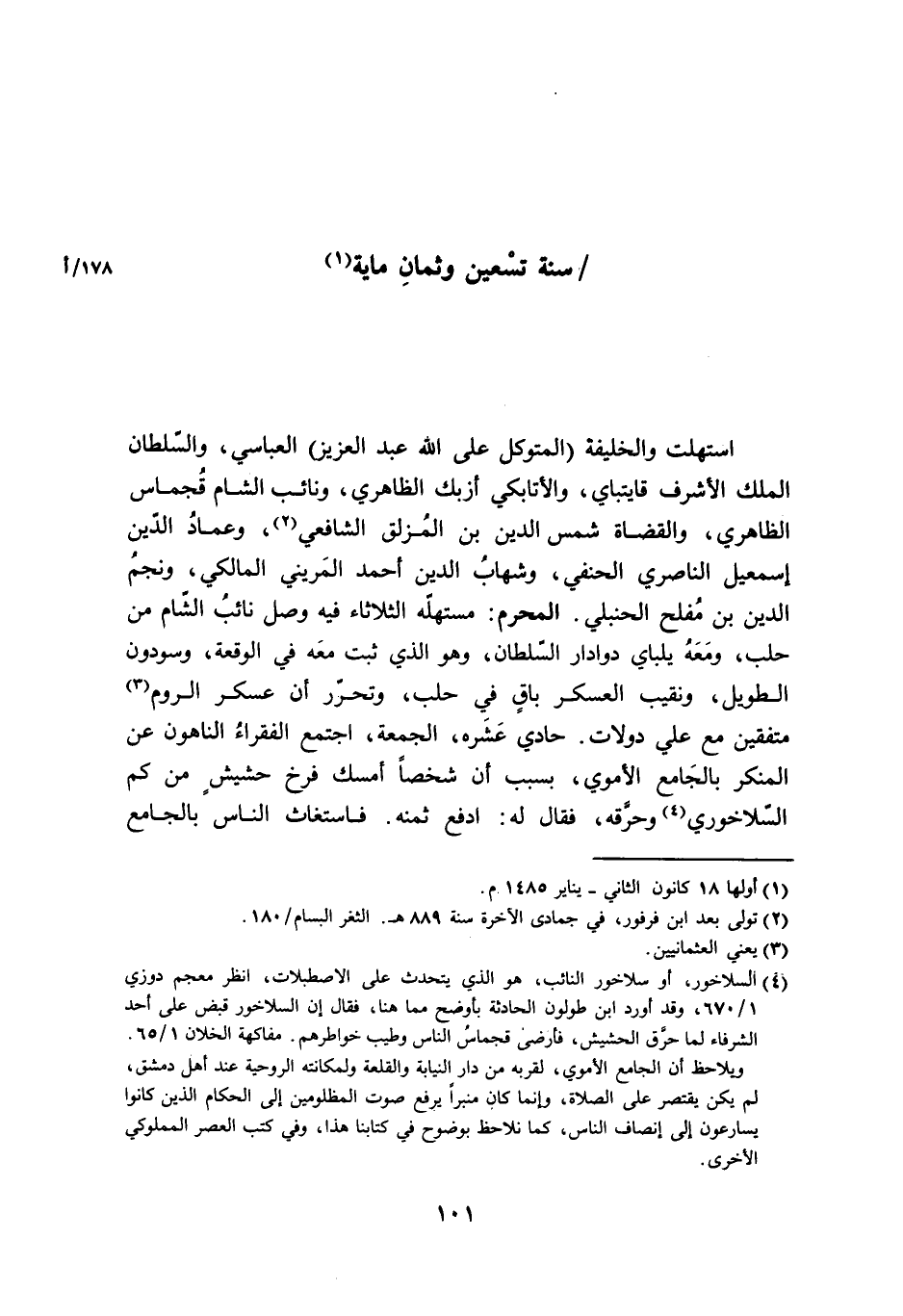 إستهلت والخليفة المتَوَكل على الله عبد الْعَزِيز العباسي وَالسُّلْطَان الْملك الْأَشْرَف قايتباي والأتابكي أزبك الظَّاهِرِيّ ونائب الشَّام قجماس الظَّاهِرِيّ والقضاة شمس الدّين بن المزلق الشَّافِعِي وعماد الدّين إِسْمَاعِيل الناصري الْحَنَفِيّ وشهاب الدّين أَحْمد المريني الْمَالِكِي وَنجم الدّين بن مُفْلِح الْحَنْبَلِيّ