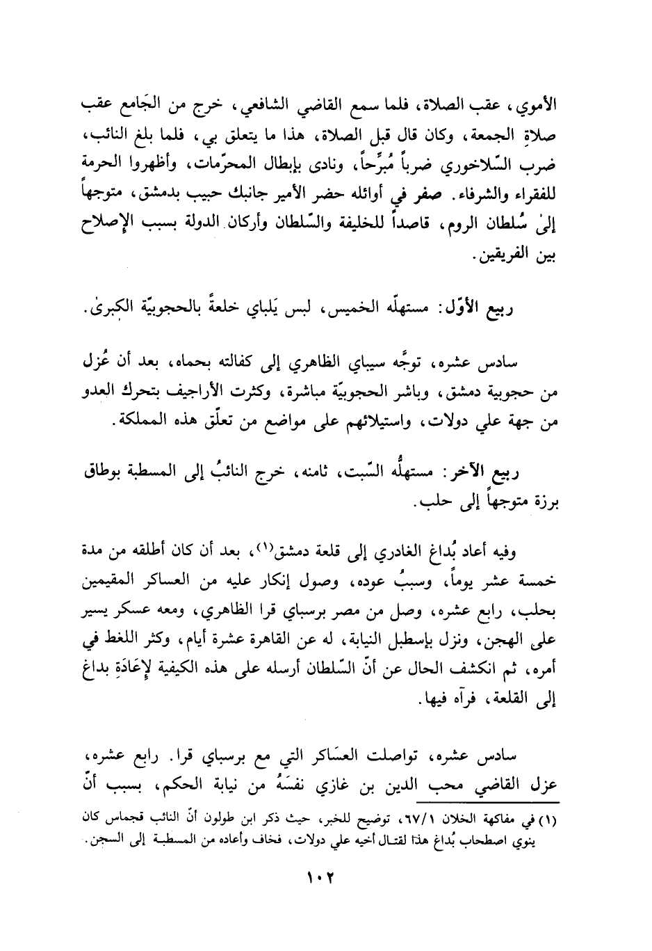 الْأمَوِي عقب الصَّلَاة فَلَمَّا سمع القَاضِي الشَّافِعِي خرج من الْجَامِع عقب صَلَاة الْجُمُعَة وَكَانَ قَالَ قبل الصَّلَاة هَذَا مَا يتَعَلَّق بِي فَلَمَّا بلغ النَّائِب ضرب السلاخوري ضربا مبرحا ونادى بِإِبْطَال الْمُحرمَات وأظهروا الْحُرْمَة للْفُقَرَاء والشرفاء صفر فِي أَوَائِله حضر الْأَمِير جَانِبك حبيب بِدِمَشْق مُتَوَجها إِلَى سُلْطَان الرّوم قَاصِدا للخليفة وَالسُّلْطَان أَرْكَان الدولة بِسَبَب الْإِصْلَاح بَين الْفَرِيقَيْنِ