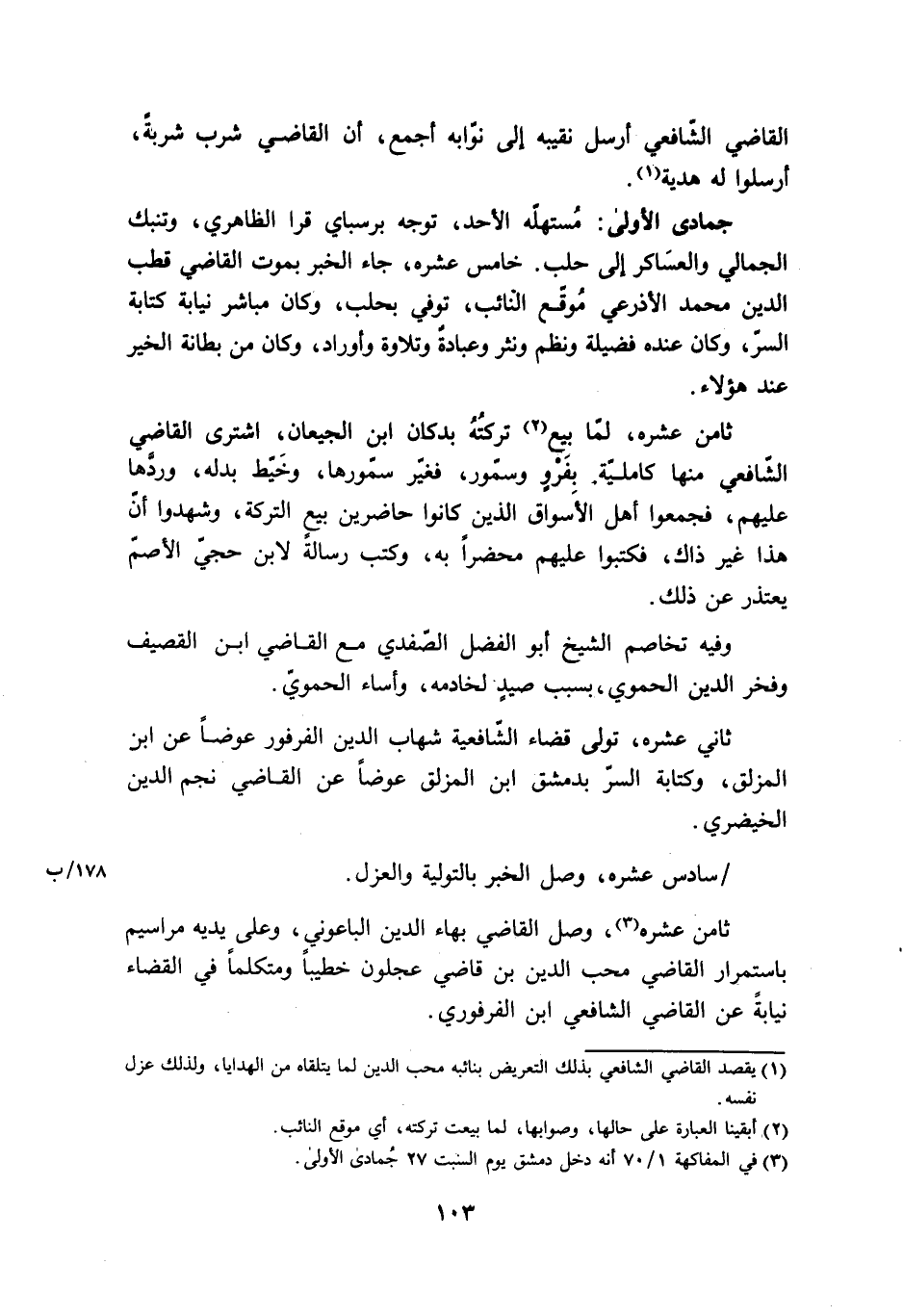 ثامن عشره وصل القَاضِي بهاء الدّين الباعوني وعَلى يَدَيْهِ مراسيم بإستمرار القَاضِي محب الدّين بن قَاضِي عجلون خَطِيبًا ومتكلما فِي الْقَضَاء نِيَابَة عَن القَاضِي الشَّافِعِي ابْن الفرفوري
