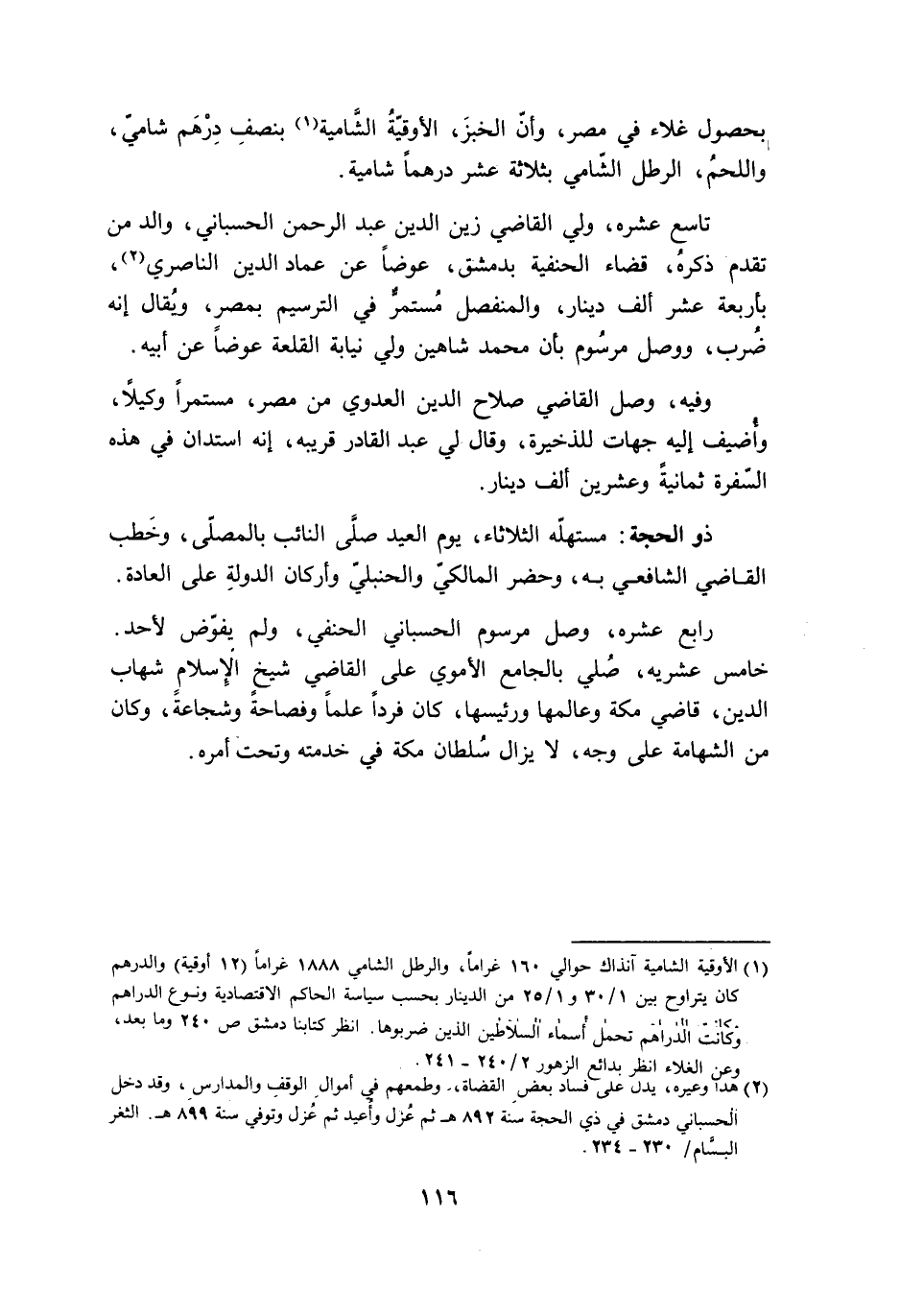 رَابِع عشره وصل مرسوم الحسباني الْحَنَفِيّ وَلم يُفَوض لأحد خَامِس عشريه صلي بالجامع الْأمَوِي على القَاضِي شيخ الْإِسْلَام شهَاب الدّين قَاضِي مَكَّة وعالمها ورئيسها كَانَ فَردا علما وفصاحة وشجاعة وَكَانَ من الشهامة على وَجه لَا يزَال سُلْطَان مَكَّة فِي خدمته وَتَحْت أمره