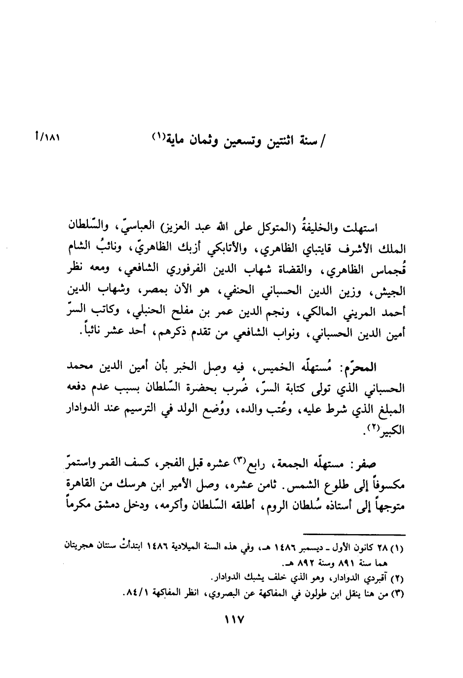 إستهلت والخليفة المتَوَكل على الله عبد الْعَزِيز العباسي وَالسُّلْطَان الْملك الْأَشْرَف قايتباي الظَّاهِرِيّ والأتابكي أزبك الظَّاهِرِيّ ونائب الشَّام قجماس الظَّاهِرِيّ والقضاة شهَاب الدّين الفرفوري الشَّافِعِي وَمَعَهُ نظر الْجَيْش وزين الدّين الحسباني الْحَنَفِيّ هُوَ الْآن بِمصْر وشهاب الدّين أَحْمد المريني الْمَالِكِي وَنجم الدّين عمر بن مُفْلِح الْحَنْبَلِيّ وَكَاتب السِّرّ أَمِين الدّين الحسباني ونواب الشَّافِعِي من تقدم ذكرهم أحد عشر نَائِبا
