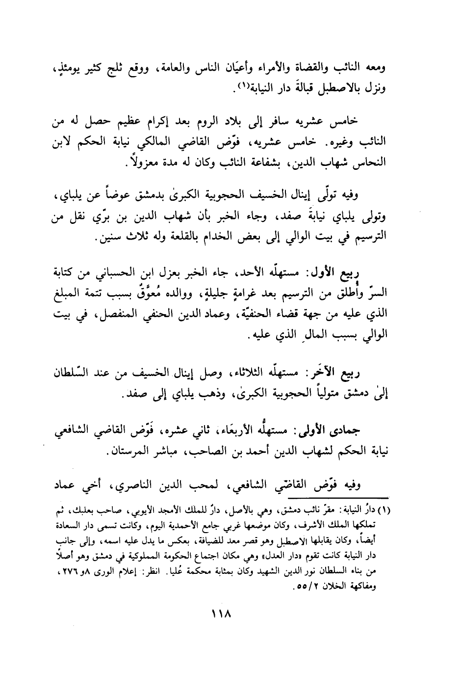 جُمَادَى الأولى مستهله الْأَرْبَعَاء ثَانِي عشره فوض القَاضِي الشَّافِعِي نِيَابَة الحكم لشهاب الدّين أَحْمد بن الصاحب مبَاشر المرستان