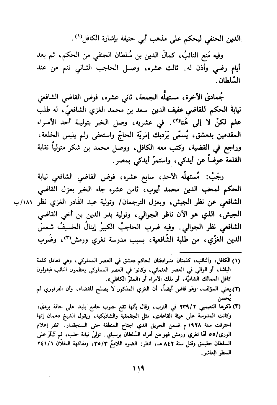 جُمَادَى الْآخِرَة مستهله الْجُمُعَة ثَانِي عشره فوض القَاضِي الشَّافِعِي نِيَابَة الحكم للْقَاضِي عفيف الدّين سعد بن مُحَمَّد الْغَزِّي الشَّافِعِي لَهُ طلب علم لَكِن لَا إِلَى هُنَا فِي عشريه وصل الْخَبَر بتولية أحد الْأُمَرَاء المقدمين بِدِمَشْق يُسمى بردبك إمرية الْحَاج وإستعفى وَلم يلبس الخلعة وراجع فِي الْقَضِيَّة وَكتب مَعَه الكافل وَوصل مُحَمَّد بن شكر مُتَوَلِّيًا نقابة القلعة عوضا عَن أيدكي وإستمر أيدكي بِمصْر
