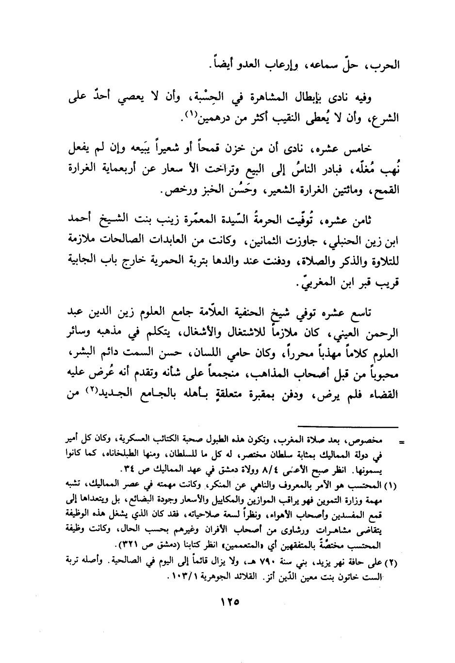 ثامن عشره توفيت الْحُرْمَة السيدة المعمرة زَيْنَب بنت الشَّيْخ أَحْمد ابْن زين الْحَنْبَلِيّ جَاوَزت الثَّمَانِينَ وَكَانَت من العابدات الصَّالِحَات مُلَازمَة للتلاوة وَالذكر وَالصَّلَاة ودفنت عِنْد والدها بتربة الحمرية خَارج بَاب الْجَابِيَة قريب قبر ابْن المغربي