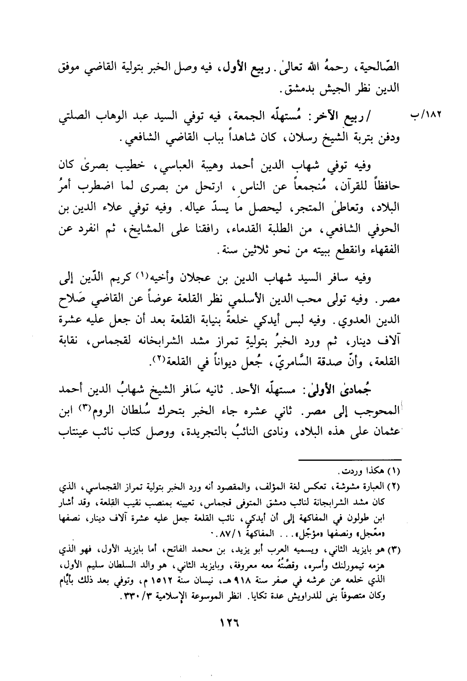 جُمَادَى الأولى مستهله الْأَحَد ثَانِيه سَافر الشَّيْخ شهَاب الدّين أَحْمد المحوجب إِلَى مصر ثَانِي عشره جَاءَ الْخَبَر بتحرك سُلْطَان الرّوم ابْن عُثْمَان على هَذِه الْبِلَاد ونادى النَّائِب بالتجريدة وَوصل كتاب نَائِب عينتاب