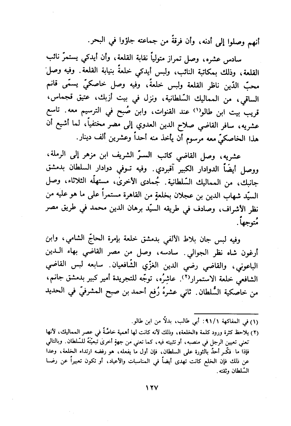 سادس عشره وصل تمراز مُتَوَلِّيًا نقابة القلعة وَأَن أيدكي يسْتَمر نَائِب القلعة وَذَلِكَ بمكاتبة النَّائِب وَلبس أيدكي خلعة بنيابة القلعة وَفِيه وصل محب الدّين نَاظر القلعة وَلبس خلعة وَفِيه وصل خاصكي يُسمى قانم الساقي من المماليك السُّلْطَانِيَّة وَنزل فِي بَيت أزبك عَتيق قجماس قريب بَيت ابْن طالو عِنْد القنوات وَابْن صبح فِي الترسيم مَعَه تَاسِع عشريه سَافر القَاضِي صَلَاح الدّين الْعَدوي إِلَى مصر مختفيا لما أشيع أَن هَذَا الخاصكي مَعَه مرسوم أَن يَأْخُذ مِنْهُ أحدا وَعشْرين ألف دِينَار