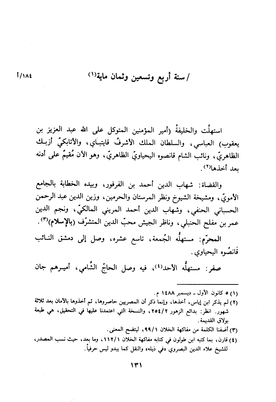 إستهلت والخليفة أَمِير الْمُؤمنِينَ المتَوَكل على الله عبد الْعَزِيز بن يَعْقُوب العباسي وَالسُّلْطَان الْملك الْأَشْرَف قايتباي والأتابكي أزبك الظَّاهِرِيّ ونائب الشَّام قانصوه اليحياوي الظَّاهِرِيّ وَهُوَ الْآن مُقيم على أدنه بعد أَخذهَا