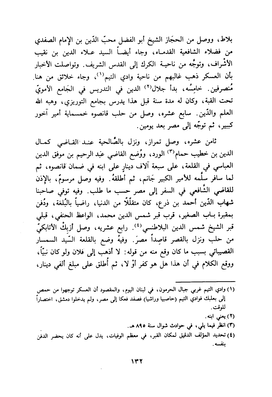 بلاط وَوصل من الْحجاز الشَّيْخ أَبُو الْفضل محب الدّين بن الإِمَام الصَّفَدِي من فضلاء الشَّافِعِيَّة القدماء وَجَاء أَيْضا السَّيِّد عَلَاء الدّين بن نقيب الْأَشْرَاف وَتوجه من نَاحيَة الكرك إِلَى الْقُدس الشريف وتواصلت الْأَخْبَار بِأَن الْعَسْكَر ذهب غالبهم من نَاحيَة وَادي التيم وَجَاء خلائق من هُنَا منصرفين خامسه بَدَأَ جلال الدّين فِي التدريس فِي الْجَامِع الْأمَوِي تَحت الْقبَّة وَكَانَ لَهُ مُدَّة سنة قبل هَذَا يدرس بِجَامِع التوريزي وهبه الله الْعلم وَالدّين سَابِع عشره وصل من حلب قانصوه خمسماية أَمِير آخور كببير ثمَّ توجه إِلَى مصر بعد يَوْمَيْنِ