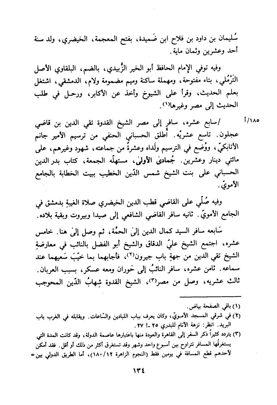سابعه سَافر السَّيِّد كَمَال الدّين إِلَى الْحمة ثمَّ وصل إِلَى هُنَا خَامِس عشره إجتمع الشَّيْخ عَليّ الدقاق وَالشَّيْخ أَبُو الْفضل بالنائب فِي مُعَارضَة الشَّيْخ تَقِيّ الدّين من جِهَة بَاب جيرون فأجابهما بِمَا خيب سعيهما عِنْد سَمَاعه ثامن عشره سَافر النَّائِب إِلَى حوران وَمَعَهُ عَسْكَر بِسَبَب العربان ثَالِث عشريه وصل من مصر الشَّيْخ الْقدْوَة شهَاب الدّين المحوجب