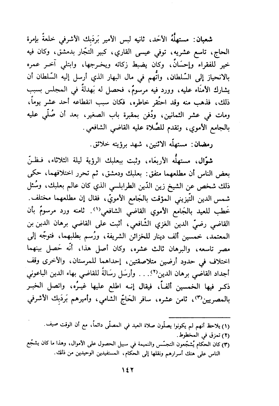 شَوَّال مستهله الْأَرْبَعَاء وَثَبت ببعلبك الرُّؤْيَة لَيْلَة الثُّلَاثَاء فَظن بعض النَّاس أَن مطلعهما مُتَّفق بعلبك ودمشق ثمَّ تحرر إختلافهما حكى ذَلِك شخص عَن الشَّيْخ زين الدّين الطرابلسي الَّذِي كَانَ عَالم بعلبك وَسُئِلَ شمس الدّين التيزيني الْمُؤَقت بالجامع الْأمَوِي فَقَالَ إِن مطلعهما مُخْتَلف خطب للعيد بالجامع الْأمَوِي القَاضِي الشَّافِعِي ثامنه ورد مرسوم بِأَن القَاضِي رَضِي الدّين الْغَزِّي الشَّافِعِي أثبت على القَاضِي برهَان الدّين بن الْمُعْتَمد خمسين ألف دِينَار للخزائن الشَّرِيفَة ورسم بطلبهما فَتوجه إِلَى مصر تاسعه والبرهان ثَالِث عشره وَكَانَ أصل هَذَا أَنه حصل بَينهمَا إختلاف فِي حُدُود أَرضين متلاصقتين إِحْدَاهمَا للمرستان وَالْأُخْرَى وقف أجداد القَاضِي برهَان الدّين وَأرْسل رِسَالَة للْقَاضِي بهاء الدّين الباعوني ذكر فِيهَا الْخمسين ألفا فَيُقَال إِنَّه اطلع عَلَيْهَا غَيره وإتصل الْخَبَر بالمصريين ثامن عشره سَافر الْحَاج الشَّامي وأميرهم بردبك الأشرفي