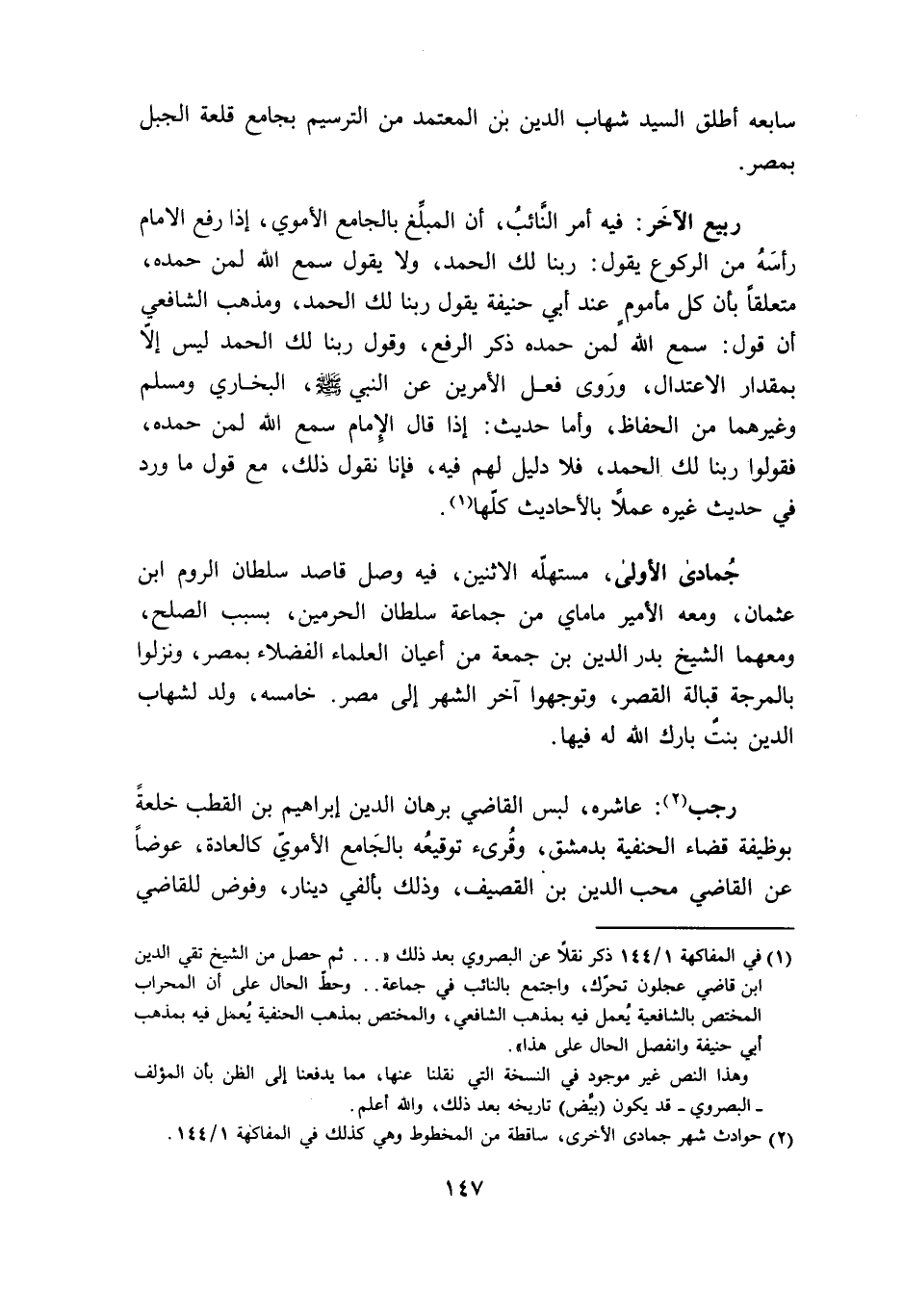 ربيع الآخر فِيهِ امْر النَّائِب ان الْمبلغ بالجامع الاموي إِذا رفع الامام رَأسه من الرُّكُوع يَقُول رَبنَا لَك الْحَمد وَلَا يَقُول سمع الله لمن حَمده مُتَعَلقا بَان كل مَأْمُوم عِنْد ابي حنيفَة يَقُول رَبنَا لَك الْحَمد وَمذهب الشَّافِعِي ان قَول سمع الله لمن حَمده ذكر الرّفْع وَقَول رَبنَا لَك الْحَمد لَيْسَ غلا بِمِقْدَار الِاعْتِدَال وروى فعل الامرين عَن النَّبِي صلى الله عَلَيْهِ وَسلم البُخَارِيّ وَمُسلم وَغَيرهمَا من الْحفاظ واما حَدِيث اذا قَالَ الامام سمع الله لمن حَمده فَقولُوا رَبنَا لَك الْحَمد فَلَا دَلِيل لَهُم فِيهِ فَإنَّا نقُول ذَلِك مَعَ قَول مَا ورد فِي حَدِيث غَيره عملا بالأحاديث كلهَا