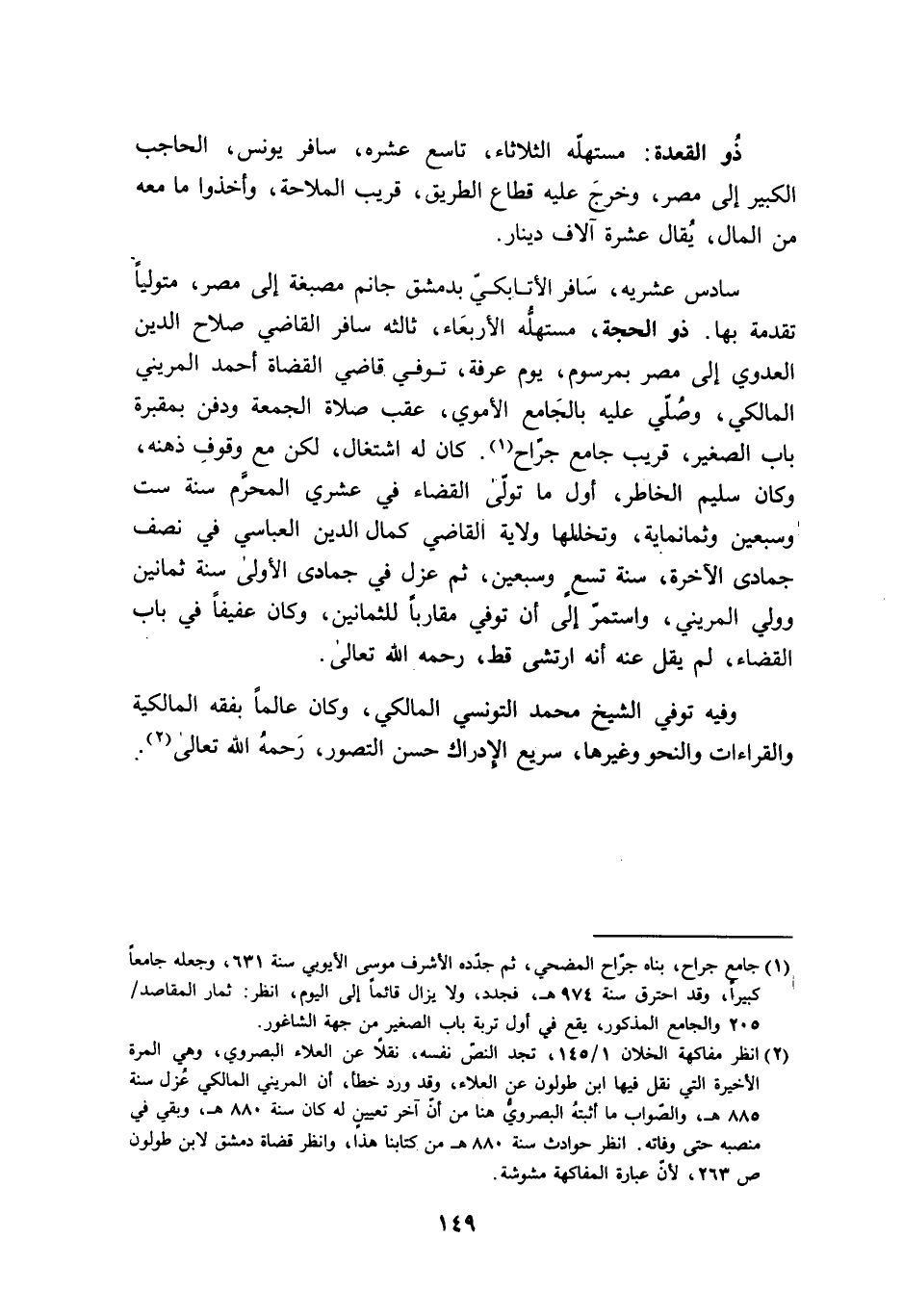 وَفِيه توفّي الشَّيْخ مُحَمَّد التّونسِيّ الْمَالِكِي وَكَانَ عَالما بِفقه الْمَالِكِيَّة والقراءات والنحو وَغَيرهَا سريع الادراك حسن التَّصَوُّر رَحمَه الله تَعَالَى
