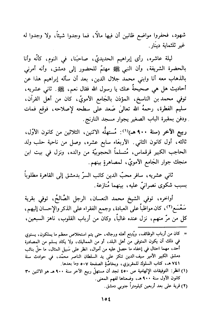 لَيْلَة عاشره رأى ابراهيم الحديدي صاحبنا فِي النّوم كَأَنَّهُ وانا بالحضرة الشَّرِيفَة وان النَّبِي صلى الله عَلَيْهِ وَسلم مهتم للحضور إِلَى دمشق وانه امرني بالذهاب مَعَه انا وَابْني مُحَمَّد جلال الدّين بعد ان ساله ابراهيم هَذَا عَن احاديث هَل هِيَ صَحِيحَة عَنْك يَا رَسُول الله فَقَالَ نعم صلى الله عَلَيْهِ وَسلم ثَانِي عشريه توفّي مُحَمَّد بن النَّاسِخ الْمُؤَذّن بالجامع الْأمَوِي كَانَ من اهل الْقُرْآن سليم الْفطْرَة رَحمَه الله تَعَالَى صعد على سطحه لاصلاحه فَوَقع فَمَاتَ وَدفن بمقبرة الْبَاب الصَّغِير بجوار مَسْجِد النارنج