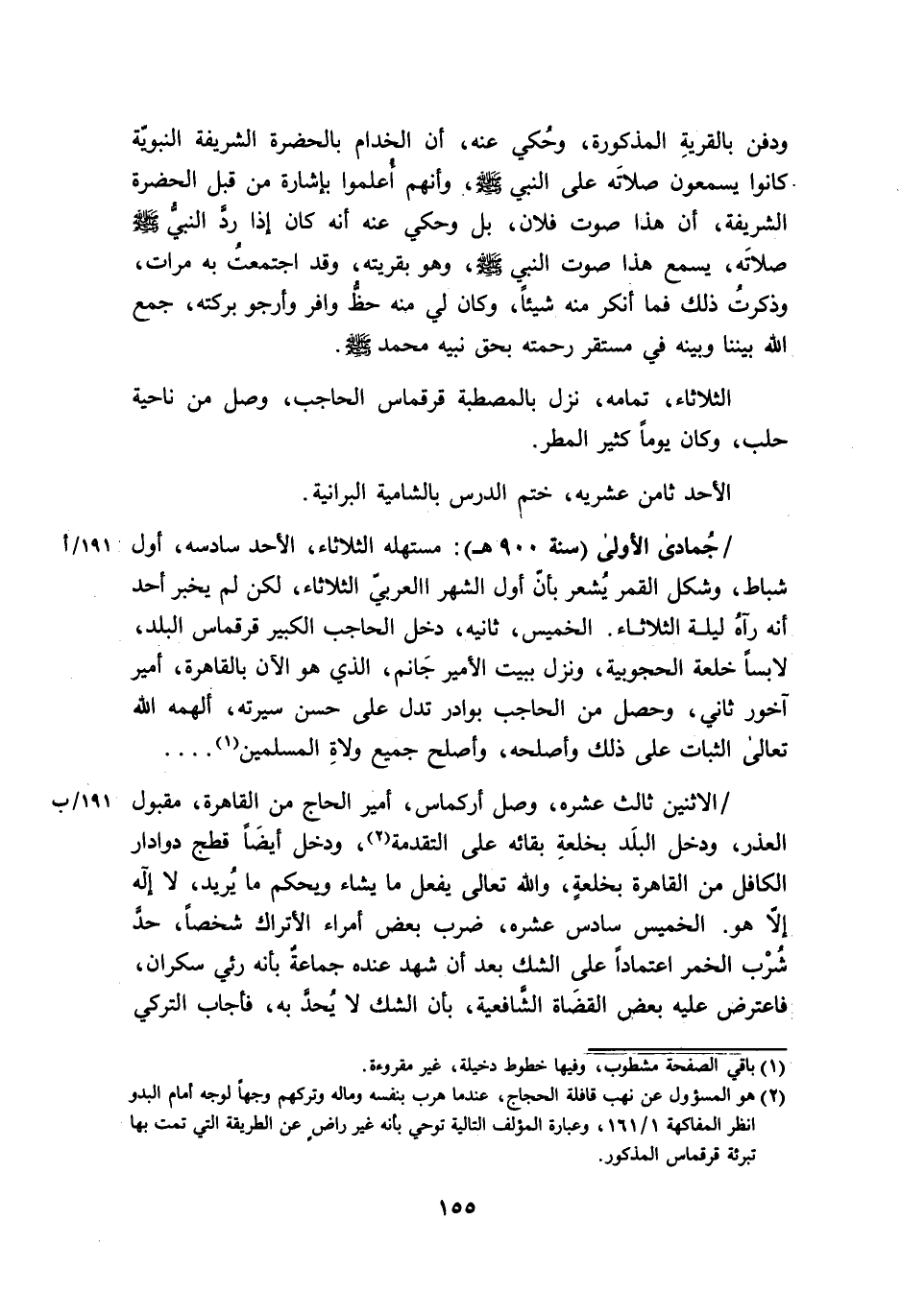 الِاثْنَيْنِ ثَالِث عشره وصل اركماس امير الْحَاج من الْقَاهِرَة مَقْبُول الْعذر وَدخل الْبَلَد بخلعة بَقَائِهِ على التقدمة وَدخل ايضا قطج دوادار الكافل من الْقَاهِرَة بخلعة وَالله تَعَالَى يفعل مَا يَشَاء وَيحكم مَا يُرِيد لَا إِلَه الا هُوَ الْخَمِيس سادس عشره ضرب بعض امراء الاتراك شخصا حد شرب الْخمر اعْتِمَادًا على الشَّك بعد ان شهد عِنْده جمَاعَة بِأَنَّهُ رئي سَكرَان فَاعْترضَ عَلَيْهِ بعض الْقُضَاة الشَّافِعِيَّة بِأَن الشَّك لَا يحد بِهِ فأجب التركي