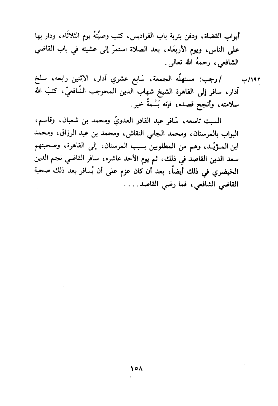 السبت تاسعه سَافر عبد الْقَادِر الْعَدوي وَمُحَمّد بن شعْبَان وقاسم البواب بالمرستان وَمُحَمّد الجابي النقاش وَمُحَمّد بن عبد الرَّزَّاق وَمُحَمّد ابْن الْمُؤَيد وهم وهم من المطلوبين بِسَبَب المرستان إِلَى الْقَاهِرَة وصحبتهم سعد الدّين القاصد فِي ذَلِك ثمَّ يَوْم الاحد عاشره سَافر القَاضِي نجم الدّين الخيضري فِي ذَلِك ايضا بعد ان كَانَ عزم على ان يُسَافر بعد ذَلِك صُحْبَة القَاضِي الشَّافِعِي فَمَا رَضِي القاصد