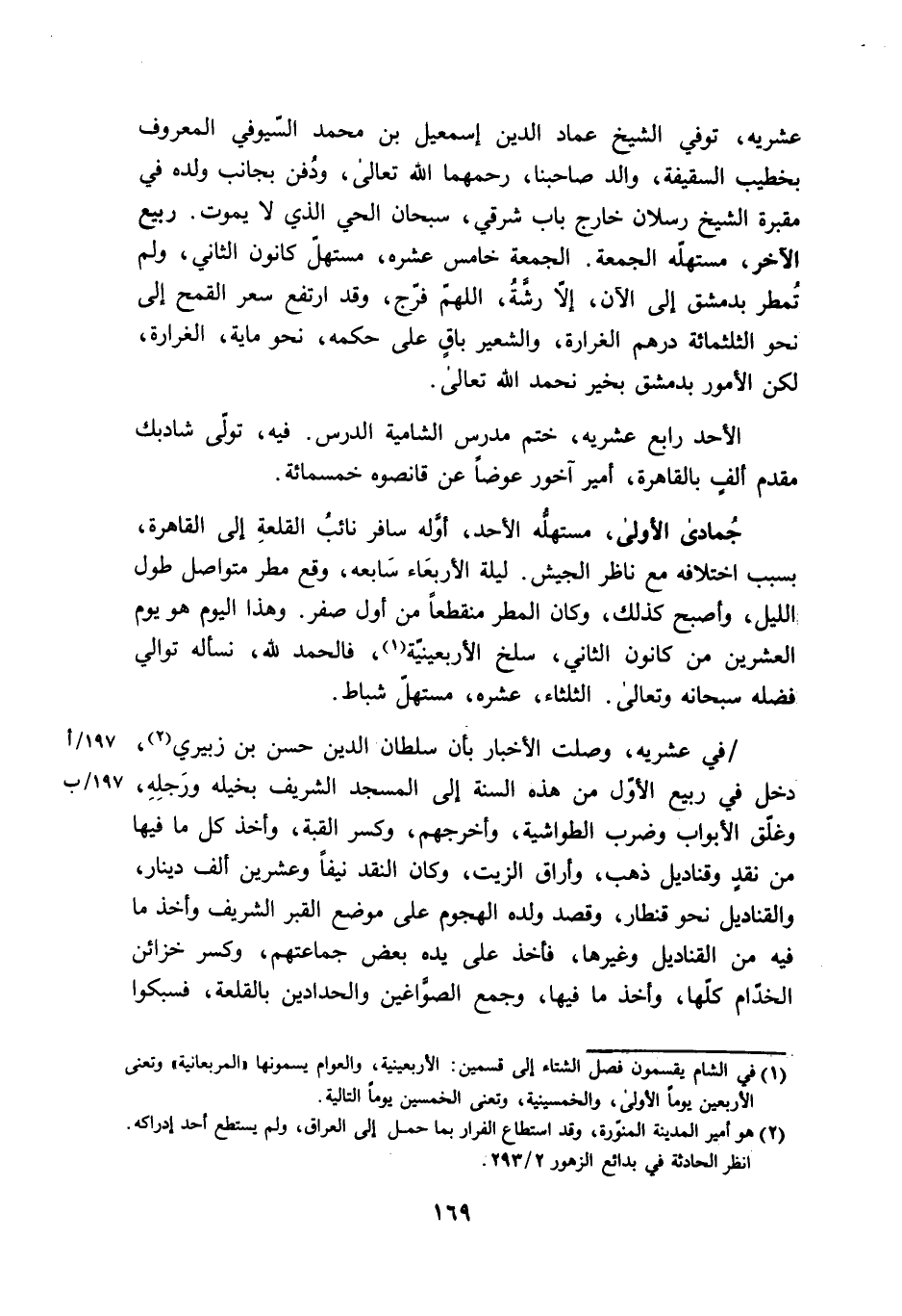 عشريه توفّي الشَّيْخ عماد الدّين اسماعيل بن مُحَمَّد السيوفي الْمَعْرُوف بخطيب السَّقِيفَة وَالِد صاحبنا رحمهمَا الله تَعَالَى وَدفن بِجَانِب وَلَده فِي مَقْبرَة الشَّيْخ رسْلَان خَارج بَاب شَرْقي سُبْحَانَ الْحَيّ الَّذِي لَا يَمُوت ربيع
