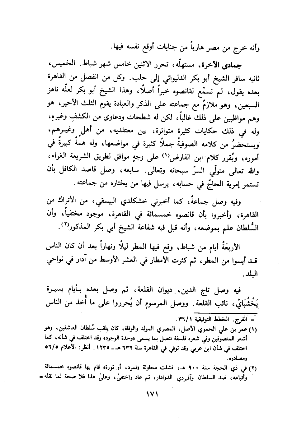 جُمَادَى الْآخِرَة مستهله تحرر الِاثْنَيْنِ خَامِس شهر شباط الْخَمِيس ثَانِيه سَافر الشَّيْخ ابو بكر الدليواتي إِلَى حلب وكل من انْفَصل من الْقَاهِرَة بعده يَقُول لم نسْمع لقانصوه خَبرا اصلا وَهَذَا الشَّيْخ ابو بكر لَعَلَّه ناهز السّبْعين وَهُوَ ملازم مَعَ جماعته على الذّكر وَالْعِبَادَة يقوم الثُّلُث الاخير هُوَ وهم مواظبين على ذَلِك غَالِبا لَكِن لَهُ شطحات ودعاوى من الْكَشْف وَغَيره وَله فِي ذَلِك حكايات كَثِيرَة متواترة بَين معتقديه من اهل وَغَيرهم ويستحضر من كَلَامه الصُّوفِيَّة جملا كَثِيرَة فِي موَاضعهَا وَله همة كَبِيرَة فِي أُمُوره ويقرر كَلَام ابْن الفارض على وَجه مُوَافق لطريق الشَّرِيعَة الغراء وَالله تَعَالَى مُتَوَلِّي السِّرّ سُبْحَانَهُ وَتَعَالَى سابعه وصل قَاصد الكافل بِأَن تستمر امرية الْحَاج فِي حسابه يُرْسل فِيهَا من يختاره من جماعته