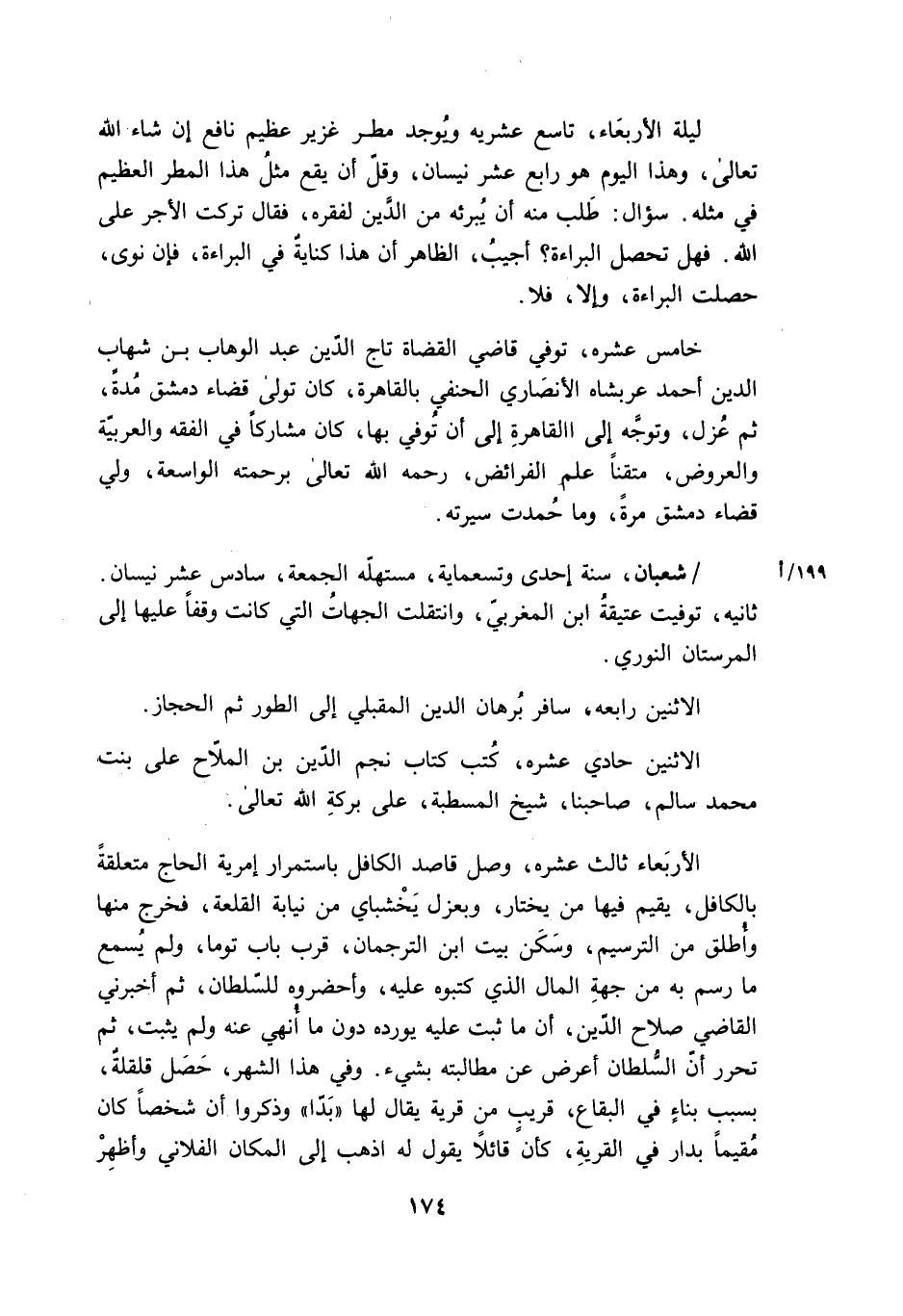 خَامِس عشره توفّي قَاضِي الْقُضَاة تَاج الدّين عبد الْوَهَّاب بن شهَاب الدّين احْمَد عربشاه الانصاري الْحَنَفِيّ بِالْقَاهِرَةِ كَانَ تولى قَضَاء دمشق مُدَّة ثمَّ عزل وَتوجه إِلَى الْقَاهِرَة إِلَى ان توفّي بهَا كَانَ مشاركا فِي الْفِقْه والعربية وَالْعرُوض متقنا علم الْفَرَائِض رَحمَه الله تَعَالَى برحمته الواسعة ولي قَضَاء دمشق مرّة وَمَا حمدت سيرته
