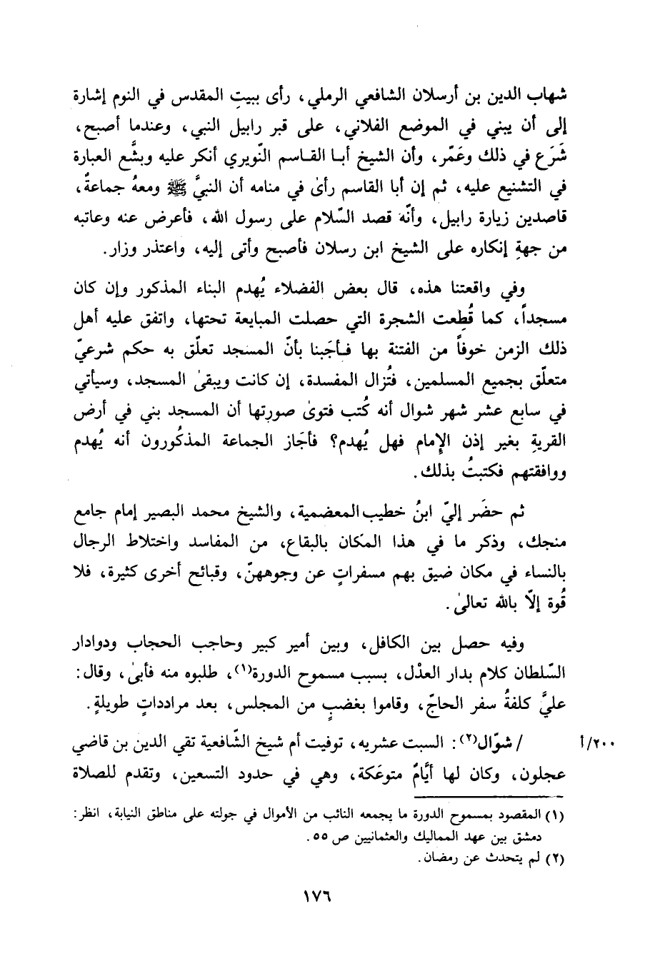 وَفِي واقعتنا هَذِه قَالَ بعض الْفُضَلَاء يهدم الْبناء الْمَذْكُور وان كَانَ مَسْجِدا كَمَا قطعت الشَّجَرَة الَّتِي حصلت الْمُبَايعَة تحتهَا وَاتفقَ عَلَيْهِ اهل ذَلِك الزَّمن خوفًا من الْفِتْنَة بهَا فأجبنا بِأَن الْمَسْجِد تعلق بِهِ حكم شَرْعِي مُتَعَلق بِجَمِيعِ الْمُسلمين فتزال الْمفْسدَة ان كَانَت وَيبقى الْمَسْجِد وَسَيَأْتِي فِي سَابِع عشر شهر شَوَّال أَنه كتب فَتْوَى صورتهَا أَن الْمَسْجِد بني فِي ارْض الْقرْيَة بِغَيْر اذن الامام فَهَل يهدم فَأجَاز الْجَمَاعَة المذكورون انه يهدم ووافقتهم فَكتبت بذلك