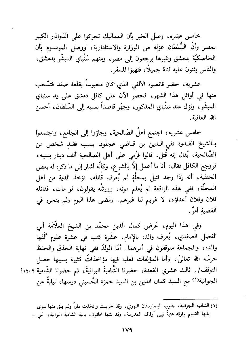 وَفِي هَذَا الْيَوْم عرض كَمَال الدّين مُحَمَّد بن الشَّيْخ الْعَلامَة ابي الْفضل الصَّفَدِي يعرف وَالِده بالامام عشرَة كتب فِي عشرَة عُلُوم الفها وَالِده وَالْجَمَاعَة متوقفون فِي امرهما اما الْوَلَد فَفِي نِهَايَة الحذق وَالْحِفْظ حرسه الله تَعَالَى واما المؤلفات فَعَلَيهِ فِيهَا مؤاخذات كَثِيرَة بِسَبَبِهَا حصل التَّوَقُّف ثَالِث عشري الْقعدَة حَضَرنَا الشامية البرانية ثمَّ حَضَرنَا الشامية الجوانية مَعَ السَّيِّد كَمَال الدّين بن السَّيِّد حَمْزَة الْحُسَيْنِي درسها نِيَابَة عَن