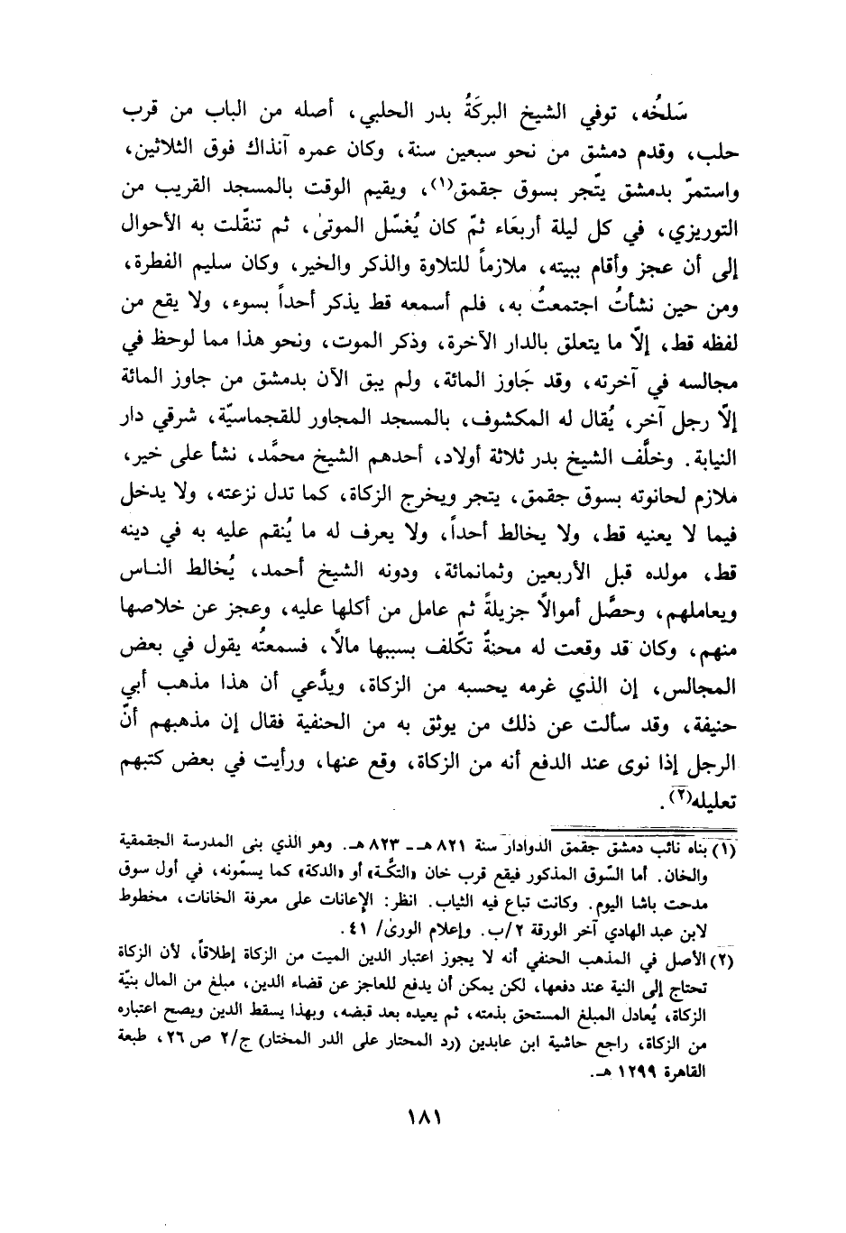 سلخه توفّي الشَّيْخ الْبركَة بدر الْحلَبِي اصله من الْبَاب من قرب حلب وَقدم دمشق من نَحْو سبعين سنة وَكَانَ عمره آنذاك فَوق الثَّلَاثِينَ وَاسْتمرّ بِدِمَشْق يتجر بسوق جقمق وَيُقِيم الْوَقْت بِالْمَسْجِدِ الْقَرِيب من التوريزي فِي كل لَيْلَة اربعاء ثمَّ كَانَ يغسل الْمَوْتَى ثمَّ تنقلت بِهِ الاحوال إِلَى ان عجز واقام ببيته ملازما للتلاوة وَالذكر وَالْخَيْر وَكَانَ سليم الْفطْرَة وَمن حِين نشأت اجْتمعت بِهِ فَلم اسْمَعْهُ قطّ يذكر احدا بِسوء وَلَا يَقع من لَفظه قطّ الا مَا يتَعَلَّق بِالدَّار الْآخِرَة وَذكر الْمَوْت وَنَحْو هَذَا مِمَّا لوحظ فِي مجالسه فِي آخرته وَقد جَاوز الْمِائَة وَلم يبْق الْآن بِدِمَشْق من جَاوز الْمِائَة الا رجل آخر يُقَال لَهُ المكشوف بِالْمَسْجِدِ المجاور للقجماسية شَرْقي دَار النِّيَابَة وَخلف الشَّيْخ بدر ثَلَاثَة اولاد احدهم الشَّيْخ مُحَمَّد نَشأ على خير ملازم لحانوته بسوق جقمق يتجر وَيخرج الزَّكَاة كَمَا تدل نَزَعته وَلَا يدْخل فِيمَا لَا يعنيه قطّ وَلَا يخالط احدا وَلَا يعرف لَهُ مَا ينقم عَلَيْهِ بِهِ فِي دينه قطّ مولده قبل الاربعين وَثَمَانمِائَة ودونه الشَّيْخ احْمَد يخالط النَّاس ويعاملهم وَحصل اموالا جزيلة ثمَّ عَامل من اكلها عَلَيْهِ وَعجز عَن خلاصها مِنْهُم وَكَانَ قد وَقعت لَهُ محنة تكلّف بِسَبَبِهَا مَالا فَسَمعته يَقُول فِي بعض الْمجَالِس ان الَّذِي غرمه يحسبه من الزَّكَاة وَيَدعِي ان هَذَا مَذْهَب ابي حنيفَة وَقد سَأَلت عَن ذَلِك من يوثق بِهِ من الْحَنَفِيَّة فَقَالَ ان مَذْهَبهم ان الرجل إِذا نوى عِنْد الدّفع انه من الزَّكَاة وَقع عَنْهَا وَرَأَيْت فِي بعض كتبهمْ تَعْلِيله