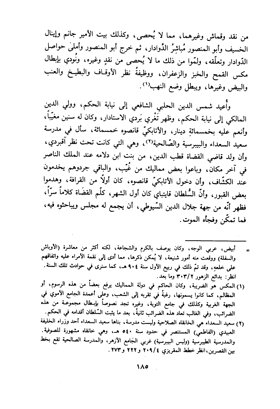 من نقد وقماش وَغَيرهمَا مِمَّا لَا يُحْصى وَكَذَلِكَ بَيت الامير جانم واينال الخسيف وابو الْمَنْصُور مبَاشر الدوادار ثمَّ خرج ابو الْمَنْصُور واملى حواصل الدوادار وتعلقه ولموا من ذَلِك مَا لَا يُحْصى من نقد وَغَيره وَنُودِيَ بابطال مكس الْقَمْح وَالْخبْز والزعفران ووظيفة نظر الاوقاف والبطيخ وَالْعِنَب وَالْبيض وَغَيرهَا وَيبْطل وضع النهب