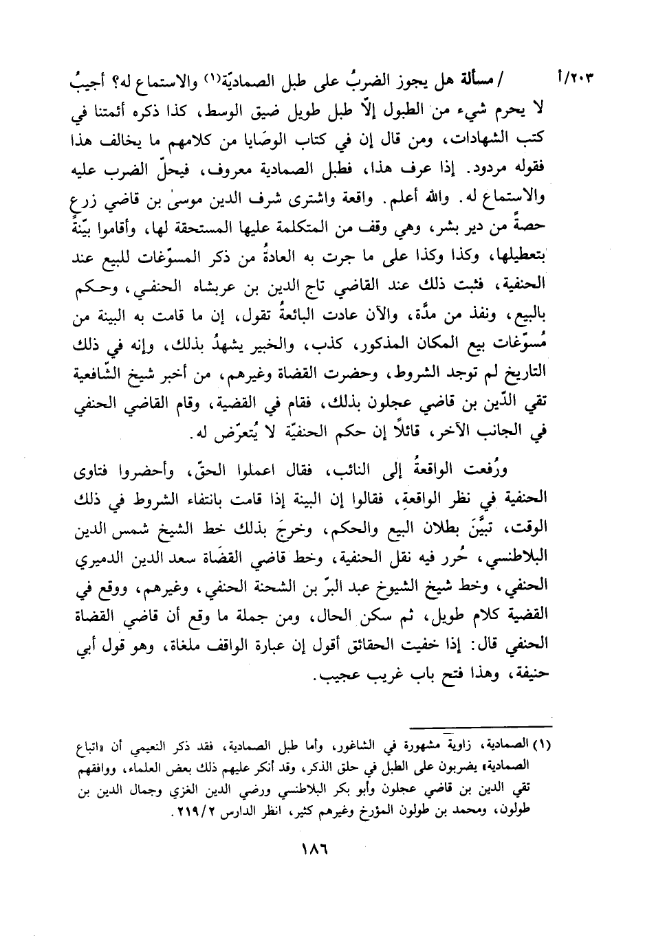 مَسْأَلَة هَل يجوز الضَّرْب على طبل الصمادية وَالِاسْتِمَاع لَهُ اجيب لايحرم شَيْء من الطبول الا طبل طَوِيل ضيق الْوسط كَذَا ذكره ائمتنا فِي كتب الشَّهَادَات وَمن قَالَ ان فِي كتاب الْوَصَايَا من كَلَامهم مَا يُخَالف هَذَا فَقَوله مَرْدُود إِذا عرف هَذَا فطبل الصمادية مَعْرُوف فَيحل الضَّرْب عَلَيْهِ وَالِاسْتِمَاع لَهُ وَالله اعْلَم وَاقعَة وَاشْترى شرف الدّين مُوسَى بن قَاضِي زرع حِصَّة من دير بشر وَهِي وقف من المتكلمة عَلَيْهَا الْمُسْتَحقَّة لَهَا واقاموا بَيِّنَة بتعطيلها وَكَذَا وَكَذَا على مَا جرت بِهِ الْعَادة من ذكر المسوغات للْبيع عِنْد الْحَنَفِيَّة فَثَبت ذَلِك عِنْد القَاضِي تَاج الدّين بن عربشاه الْحَنَفِيّ وَحكم بِالْبيعِ وَنفذ من مُدَّة والآن عَادَتْ البائعة تَقول ان مَا قَامَت بِهِ الْبَيِّنَة من مسوغات بيع الْمَكَان الْمَذْكُور كذب والخبير يشْهد بذلك وانه فِي ذَلِك التَّارِيخ لم تُوجد الشُّرُوط وَحَضَرت الْقُضَاة وَغَيرهم من اخبر شيخ الشَّافِعِيَّة تَقِيّ الدّين بن قَاضِي عجلون بذلك فَقَامَ فِي الْقَضِيَّة وَقَامَ القَاضِي الْحَنَفِيّ فِي الْجَانِب الآخر قَائِلا ان حكم الْحَنَفِيَّة لَا يتَعَرَّض لَهُ