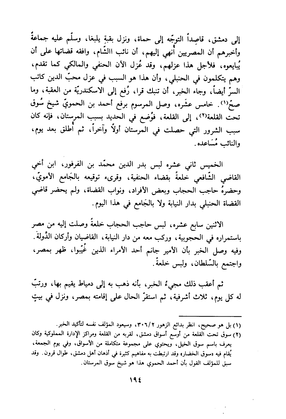 إِلَى دمشق قَاصِدا التَّوَجُّه إِلَى حماة وَنزل بقبة يلبغا وَسلم عَلَيْهِ جمَاعَة واخبرهم ان المصريين انهي اليهم ان نَائِب الشَّام وَافقه قضاتها على ان يبايعوه فلأجل هَذَا عزلهم وَقد عزل الْآن الْحَنَفِيّ والمالكي كَمَا تقدم وهم يَتَكَلَّمُونَ فِي الْحَنْبَلِيّ وان هَذَا هُوَ السَّبَب فِي عزل محب الدّين كَاتب السِّرّ ايضا وَجَاء الْخَبَر ان تنبك قرا رفع إِلَى الاسكندرية من الْعقبَة وَمَا صَحَّ خَامِس عشره وصل المرسوم بِرَفْع احْمَد بن الْحَمَوِيّ شيخ سوق تَحت القلعة إِلَى القلعة فَوضع فِي الْحَدِيد بِسَبَب المرستان فَإِنَّهُ كَانَ سَبَب الشرور الَّتِي حصلت فِي المرستان اولا وآخرا ثمَّ اطلق بعد يَوْم والنائب مساعده