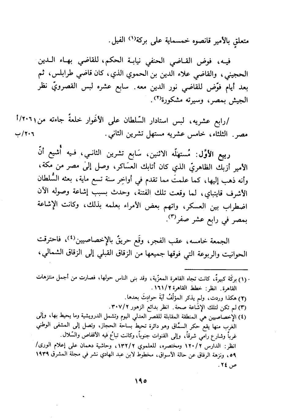 فِيهِ فوض القَاضِي الْحَنَفِيّ نِيَابَة الحكم للْقَاضِي بهاء الدّين الحجيني وَالْقَاضِي عَلَاء الدّين بن الْحَمَوِيّ الَّذِي كَانَ قَاضِي طرابلس ثمَّ بعد ايام فوض للْقَاضِي نور الدّين مَعَه سَابِع عشره لبس القصروي نظر الْجَيْش بِمصْر وَسيرَته مشكورة