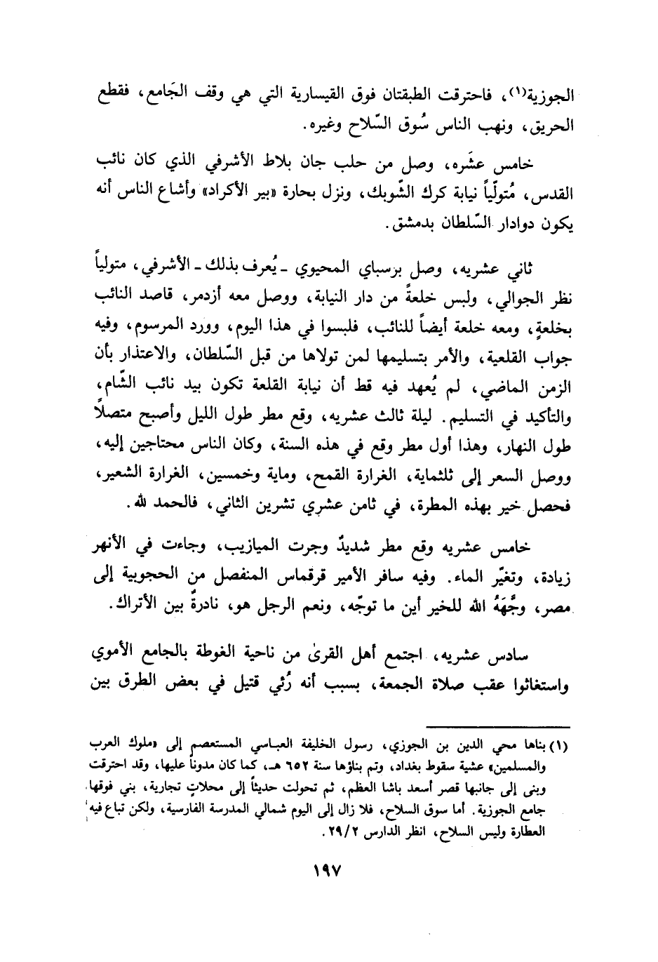 ثَانِي عشريه وصل برسباي المحيوي يعرف بذلك الاشرفي مُتَوَلِّيًا نظر الجوالي وَلبس خلعة من دَار النِّيَابَة وَوصل مَعَه ازدمر قَاصد النَّائِب بخلعة وَمَعَهُ خلعة ايضا للنائب فلبسوا فِي هَذَا الْيَوْم وَورد المرسوم وَفِيه جَوَاب القلعية والامر بتسليمها لمن تولاها من قبل السُّلْطَان والاعتذار بَان الزَّمن الْمَاضِي لم يعْهَد فِيهِ قطّ ان نِيَابَة القلعة تكون بيد نَائِب الشَّام والتأكيد فِي التَّسْلِيم لَيْلَة ثَالِث عشريه وَقع مطر طول اللَّيْل واصبح مُتَّصِلا طول النَّهَار وَهَذَا اول مطر وَقع فِي هَذِه السّنة وَكَانَ النَّاس مُحْتَاجين اليه وَوصل السّعر إِلَى ثلثماية الغرارة الْقَمْح وماية وَخمسين الغرارة الشّعير فَحصل خير بِهَذِهِ المطرة فِي ثامن عشري تشرين الثَّانِي فَالْحَمْد لله