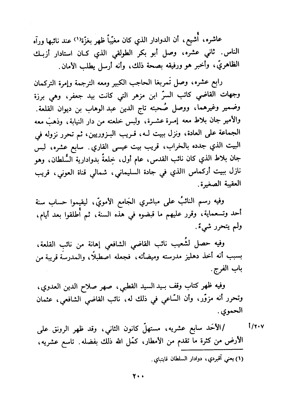 رَابِع عشره وصل تمربغا الْحَاجِب الْكَبِير وَمَعَهُ التَّرْجَمَة وامرة التركمان وجهات القَاضِي كَاتب السِّرّ ابْن مزهر الَّتِي كَانَت بيد جَعْفَر وَهِي بَرزَة وَضمير وَغَيرهمَا وَوصل صحبته تَاج الدّين عبد الْوَهَّاب بن ديوَان القلعة والامير جَان بلاط مَعَه امرة عشرَة وَلبس خلعته من دَار النِّيَابَة وَذهب مَعَه الْجَمَاعَة على الْعَادة وَنزل بِبَيْت لَهُ قريب المزوريين ثمَّ تحرر نُزُوله فِي الْبَيْت الَّذِي جدده بالخراب قريب بَيت عِيسَى الْقَارِي سَابِع عشره لبس جَان بلاط الَّذِي كَانَ نَائِب الْقُدس عَام اول خلعة بدوادارية السُّلْطَان وَهُوَ نَازل بِبَيْت اركماس الَّذِي فِي جادة السُّلَيْمَانِي شمَالي قناة العوني قريب العقيبة الصَّغِيرَة