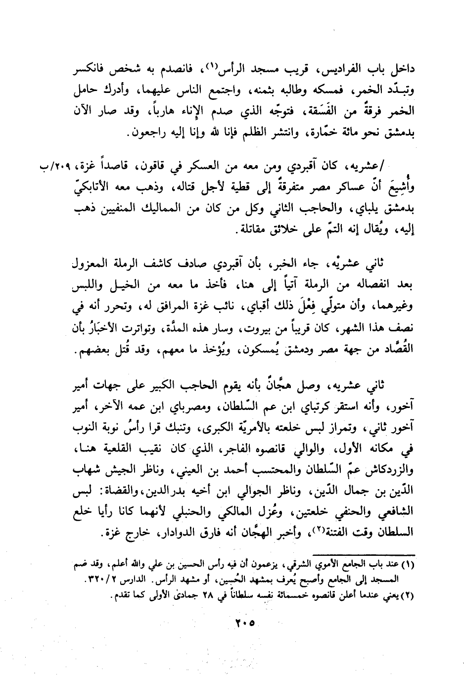 دَاخل بَاب الفراديس قريب مَسْجِد الرَّأْس فانصدم بِهِ شخص فانكسر وتبدد الْخمر فمسكه وطالبه بِثمنِهِ وَاجْتمعَ النَّاس عَلَيْهِمَا وادرك حَامِل الْخمر فرقة من الفسقة فَتوجه الَّذِي صدم الاناء هَارِبا وَقد صَار الْآن بِدِمَشْق نَحْو مائَة خمارة وانتشر الظُّلم فانا لله وانا اليه رَاجِعُون