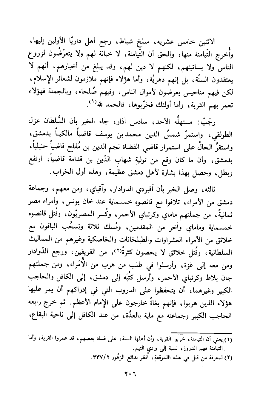 رَجَب مستهله الْأَحَد سادس آذار جَاءَ الْخَبَر بِأَن السُّلْطَان عزل الطولقي وَاسْتمرّ شمس الدّين مُحَمَّد بن يُوسُف قَاضِيا مالكيا بِدِمَشْق وَاسْتقر الْحَال على اسْتِمْرَار قَاضِي الْقُضَاة نجم الدّين بن مُفْلِح قَاضِيا حنبليا بِدِمَشْق وَأَن مَا كَانَ وَقع من تَوْلِيَة شهَاب الدّين بن قدامَة قَاضِيا ارْتَفع وَبَطل وَحصل بِهَذَا بِشَارَة لأهل دمشق عَظِيمَة وَهَذِه أول الخراب