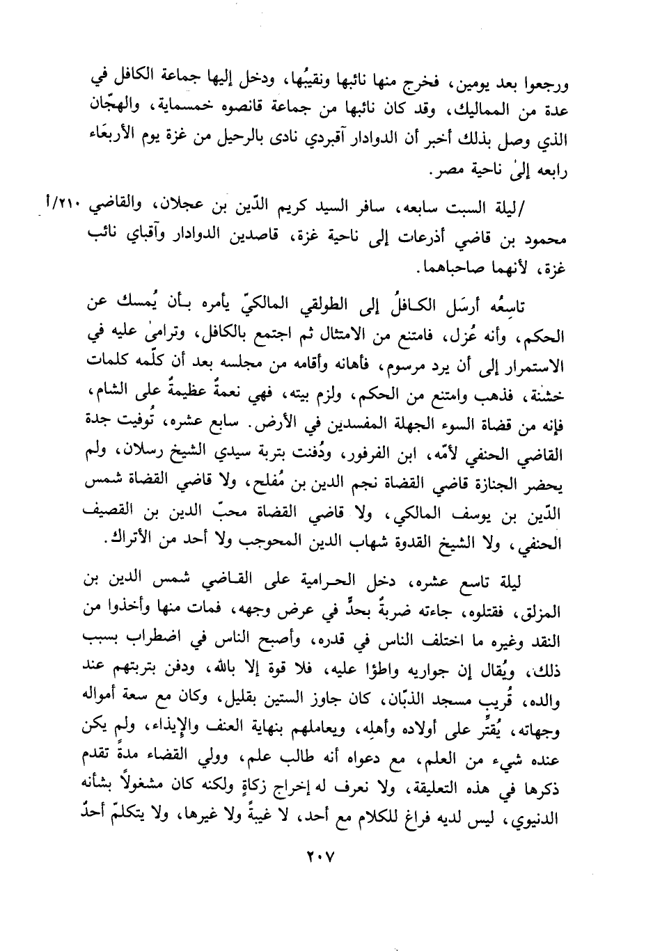 تاسعه ارسل الكافل إِلَى الطولقي الْمَالِكِي يامره بَان يمسك عَن الحكم وانه عزل فَامْتنعَ من الِامْتِثَال ثمَّ اجْتمع بالكافل وترامى عَلَيْهِ فِي الِاسْتِمْرَار إِلَى ان يرد مرسوم فأهانه واقامه من مَجْلِسه بعد ان كَلمه كَلِمَات خشنة فَذهب وَامْتنع من الحكم وَلزِمَ بَيته فَهِيَ نعْمَة عَظِيمَة على الشَّام فَإِنَّهُ من قُضَاة السوء الجهلة المفسدين فِي الارض سَابِع عشره توفيت جدة القَاضِي الْحَنَفِيّ لامه ابْن الفرفور ودفنت بتربة سَيِّدي الشَّيْخ رسْلَان وَلم يحضر الْجِنَازَة قَاضِي الْقُضَاة نجم الدّين بن مُفْلِح وَلَا قَاضِي الْقُضَاة شمس الدّين بن يُوسُف الْمَالِكِي وَلَا قَاضِي الْقُضَاة محب الدّين بن القصيف الْحَنَفِيّ وَلَا الشَّيْخ الْقدْوَة شهَاب الدّين المحوجب وَلَا اُحْدُ من الاتراك