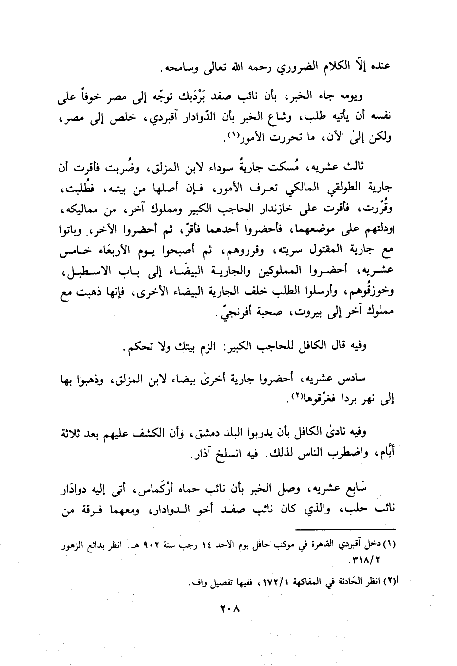 ثَالِث عشريه مسكت جَارِيَة سَوْدَاء لِابْنِ المزلق وَضربت فأقرت ان جَارِيَة الطولقي الْمَالِكِي تعرف الامور فان اصلها من بَيته فطلبت وقررت فأقرت على خازندار الْحَاجِب الْكَبِير ومملوك آخر من مماليكه ودلتهم على موضعهما فأحضروا احدهما فَأقر ثمَّ احضروا الآخر وَبَاتُوا مَعَ جَارِيَة الْمَقْتُول سريته وقرروهم ثمَّ اصبحوا يَوْم الاربعاء خَامِس عشريه احضروا المملوكين وَالْجَارِيَة الْبَيْضَاء إِلَى بَاب الاسطبل وخوزقوهم وارسلوا الطّلب خلف الْجَارِيَة الْبَيْضَاء الاخرى فانها ذهبت مَعَ مَمْلُوك آخر إِلَى بيروت صُحْبَة افرنجي