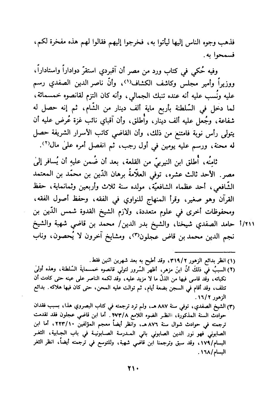وَفِيه حُكيَ فِي كتاب ورد من مصر ان آقبردي اسْتَقر دوادارا واستادارا ووزيرا وامير مجْلِس وَكَاشف الْكَشَّاف وان نَاصِر الدّين الصَّفَدِي رسم عَلَيْهِ وَنسب عَلَيْهِ انه عِنْده تنبك الجمالي وانه كَانَ الْتزم لقانصوه خَمْسمِائَة لما دخل فِي السلطنة بِأَرْبَع ماية الف دِينَار من الشَّام ثمَّ انه حصل لَهُ شَفَاعَة وَجعل عَلَيْهِ الف دِينَار واطلق وان آقباي نَائِب غَزَّة عرض عَلَيْهِ ان يتَوَلَّى رَأس نوبَة فَامْتنعَ من ذَلِك وان القَاضِي كَاتب الاسرار الشَّرِيفَة حصل لَهُ محنة ورسم عَلَيْهِ يَوْمَيْنِ فِي اول رَجَب ثمَّ انْفَصل امْرَهْ على مَال
