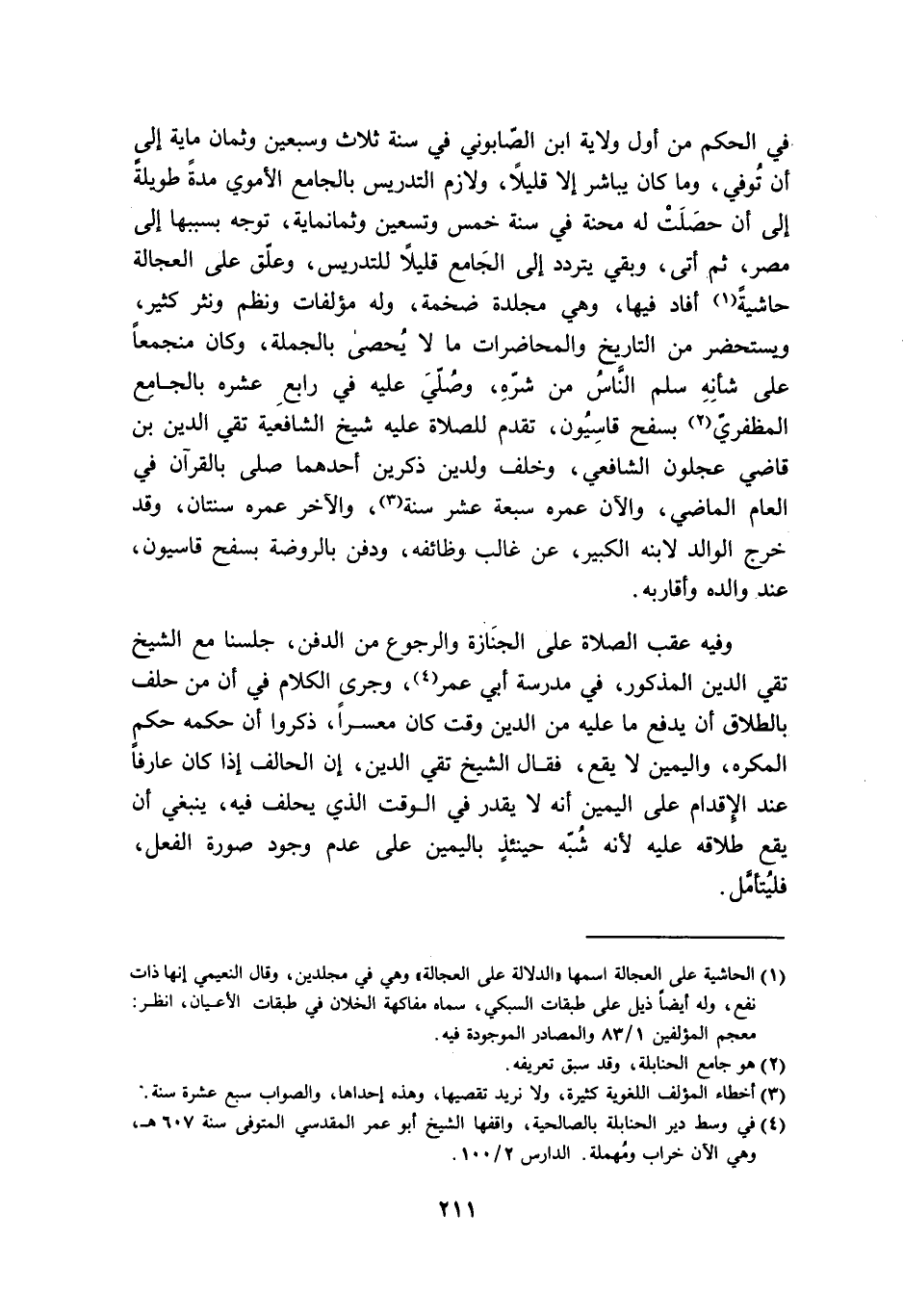 فِي الحكم من اول ولَايَة ابْن الصَّابُونِي فِي سنة ثَلَاث وَسبعين وثمان ماية إِلَى ان توفّي وَمَا كَانَ يُبَاشر الا قَلِيلا ولازم التدريس بالجامع الْأمَوِي مُدَّة طَوِيلَة إِلَى ان حصلت لَهُ محنة فِي سنة خمس وَتِسْعين وثمانماية توجه بِسَبَبِهَا إِلَى مصر ثمَّ اتى وَبَقِي يتَرَدَّد إِلَى الْجَامِع قَلِيلا للتدريس وعلق على العجالة حَاشِيَة افاد فِيهَا وَهِي مجلدة ضخمة وَله مؤلفات ونظم ونثر كثير ويستحضر من التَّارِيخ والمحاضرات مَا لَا يُحْصى بِالْجُمْلَةِ وَكَانَ منجمعا على شَأْنه سلم النَّاس من شَره وَصلي عَلَيْهِ فِي رَابِع عشره بالجامع المظفري بسفح قاسيون تقدم للصَّلَاة عَلَيْهِ شيخ الشَّافِعِيَّة تَقِيّ الدّين بن قَاضِي عجلون الشَّافِعِي وَخلف وَلدين ذكرين احدهما صلى بِالْقُرْآنِ فِي الْعَام الْمَاضِي والآن عمره سَبْعَة عشر سنة وَالْآخر عمره سنتَانِ وَقد خرج الْوَالِد لِابْنِهِ الْكَبِير عَن غَالب وظائفه وَدفن بالروضة بسفح قاسيون عِنْد وَالِده واقاربه