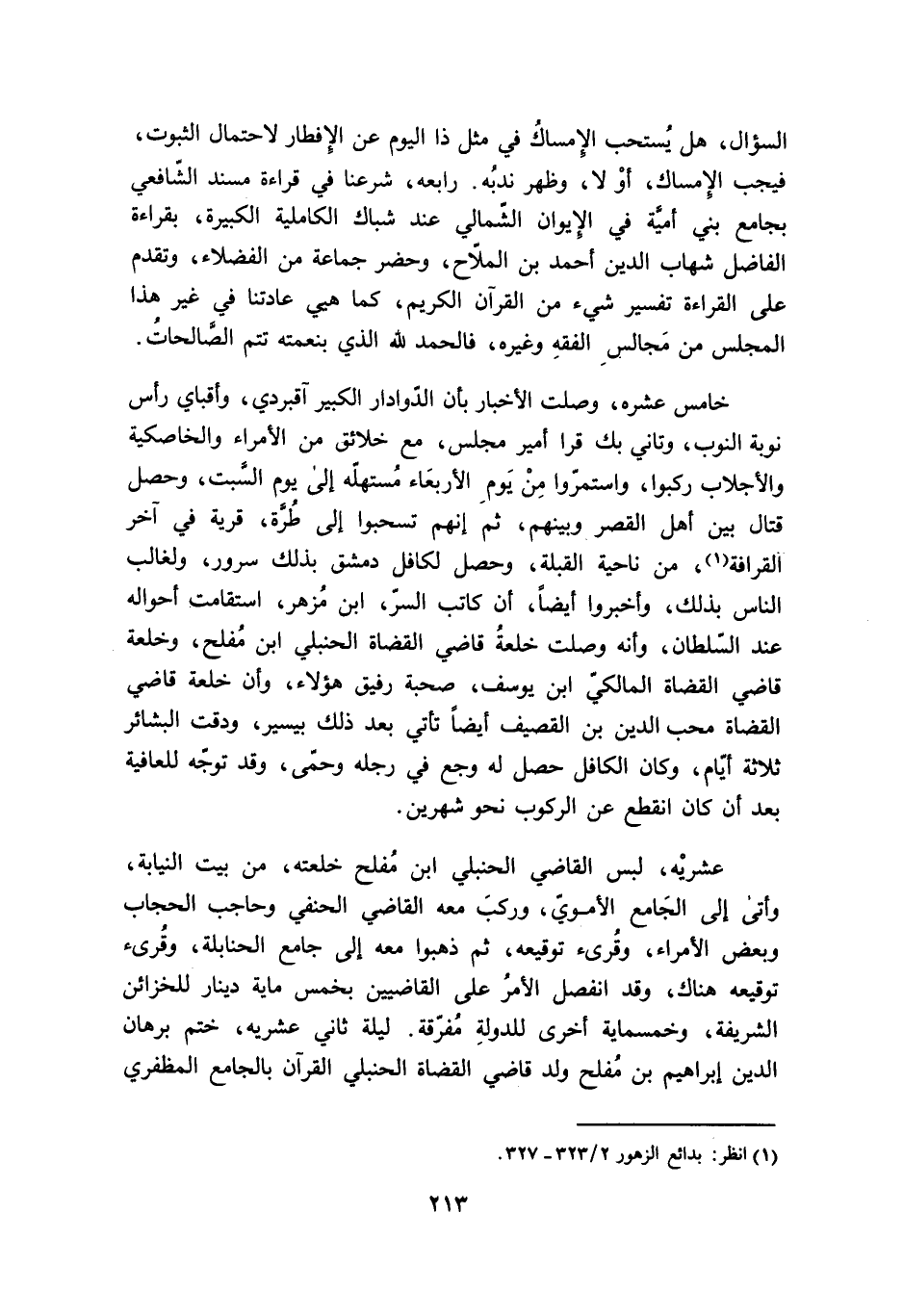 عشريه لبس القَاضِي الْحَنْبَلِيّ ابْن مُفْلِح خلعته من بَيت النِّيَابَة واتى إِلَى الْجَامِع الْأمَوِي وَركب مَعَه القَاضِي الْحَنَفِيّ وحاجب الْحجاب وَبَعض الامراء وَقُرِئَ توقيعه ثمَّ ذَهَبُوا مَعَه إِلَى جَامع الْحَنَابِلَة وَقُرِئَ توقيعه هُنَاكَ وَقد انْفَصل الامر على القاضيين بِخمْس ماية دِينَار للخزائن الشَّرِيفَة وخمسماية اخرى للدولة مفرقة لَيْلَة ثَانِي عشريه ختم برهَان الدّين ابراهيم بن مُفْلِح ولد قَاضِي الْقُضَاة الْحَنْبَلِيّ الْقُرْآن بالجامع المظفري