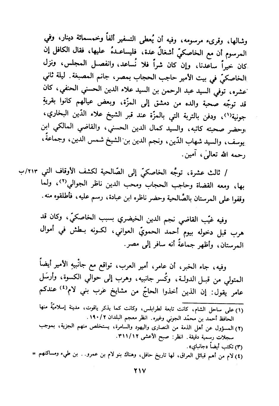 وشالها وَقُرِئَ مرسومه وَفِيه ان يعْطى التسفير الْفَا وَخَمْسمِائة دِينَار وَفِي المرسوم ان مَعَ الخاصكي اشغال عدَّة فليساعده عَلَيْهَا فَقَالَ الكافل ان كَانَ خيرا ساعدنا وان كَانَ شرا فَلَا نساعد وانفصل الْمجْلس وَنزل الخاصكي فِي بَيت الامير حَاجِب الْحجاب بِمصْر جانم المصبغة لَيْلَة ثَانِي عشره توفّي السَّيِّد عبد الرَّحْمَن بن السَّيِّد عَلَاء الدّين الحسني الْحَنَفِيّ كَانَ قد توجه صُحْبَة وَالِده من دمشق إِلَى المزة وَبَعض عِيَالهمْ كَانُوا بقرية جونية وَدفن بالتربة الَّتِي بالمزة عِنْد قبر الشَّيْخ عَلَاء الدّين البُخَارِيّ وَحضر صحبته كَاتبه وَالسَّيِّد كَمَال الدّين الحسني وَالْقَاضِي الْمَالِكِي ابْن يُوسُف وَالسَّيِّد شهَاب الدّين وَنجم الدّين بن الشَّيْخ شمس الدّين وَجَمَاعَة رَحمَه الله تَعَالَى آمين